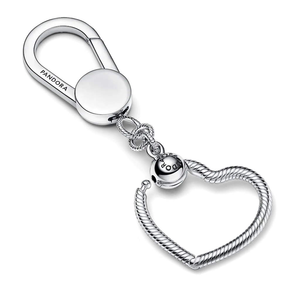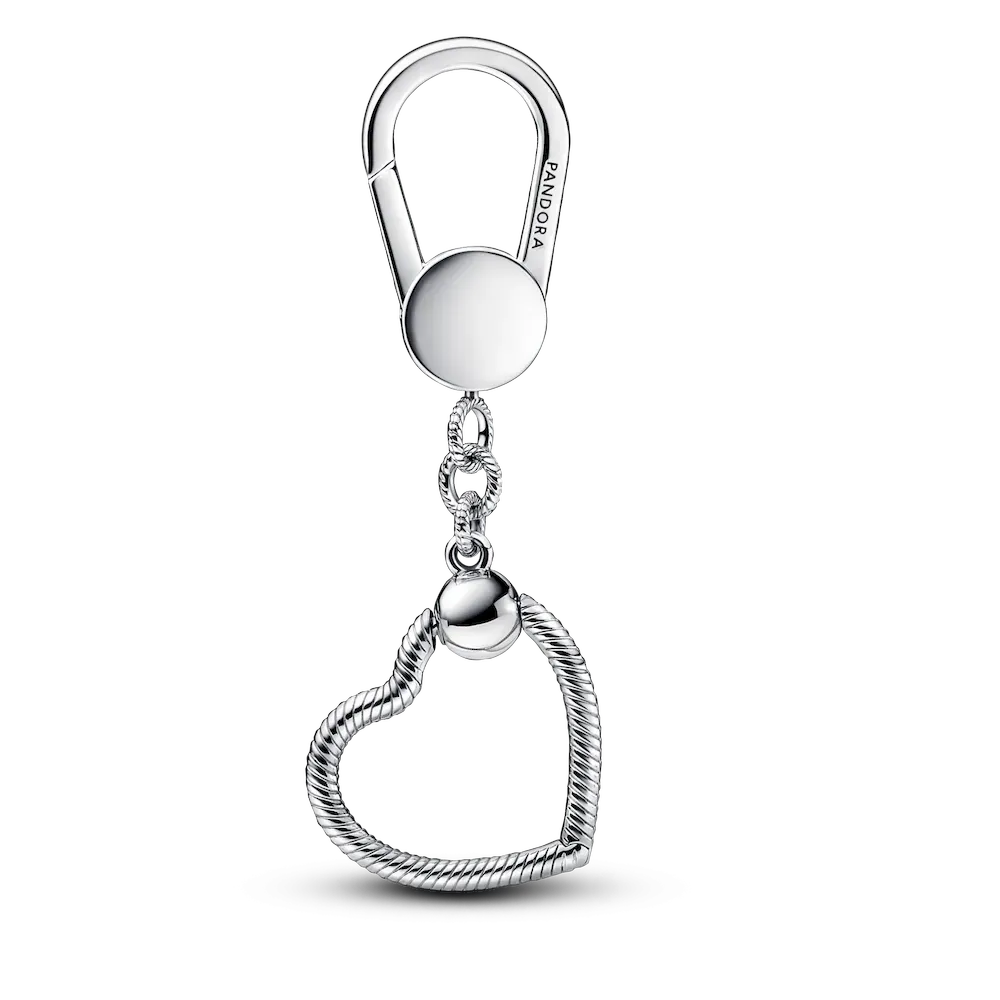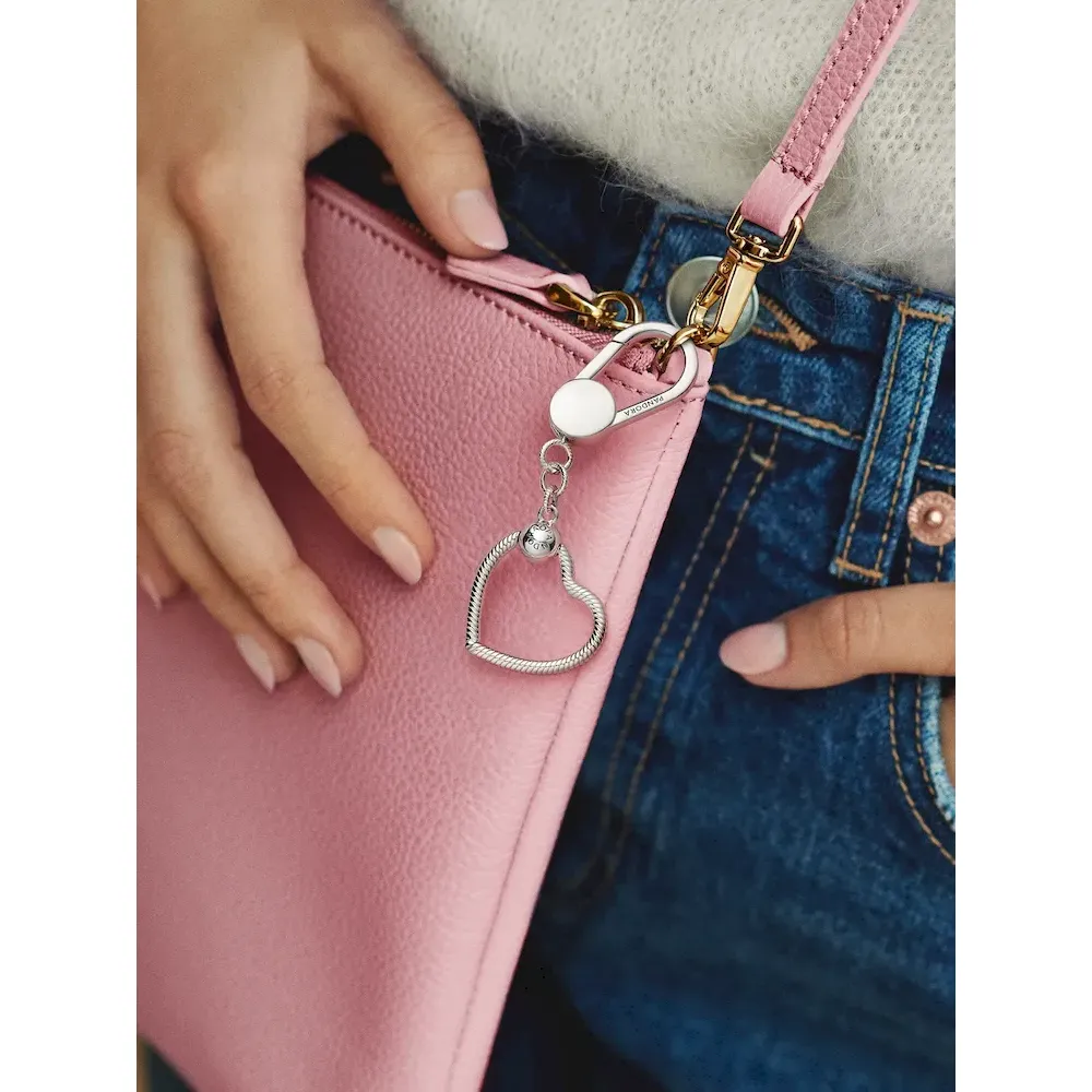 Personalize your bag with the Pandora Moments Small Heart Bag Charm Holder. Crafted in sterling silver, it features a heart-shaped pendant and a disc that can be engraved with your personal mantra. Style up to three of your favorite charms, dangles and pendants and make your bag a part of your story.