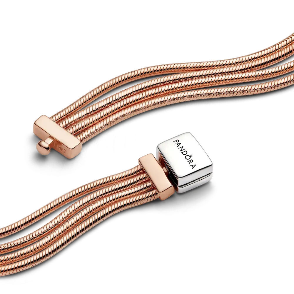 Wear the Pandora Reflexions Multi Snake Chain Bracelet alone or loaded with clip-on charms. The two-tone design comes to life when styled with your favourite symbols. The four individual snake chain strands are hand-finished in 14k rose gold plating, while the clasp is made from sterling silver and provides a cool contrast to the warm tones of the rose gold-coloured finish. Wear it stacked with other Pandora Reflexions bracelets or alone for a statement look.