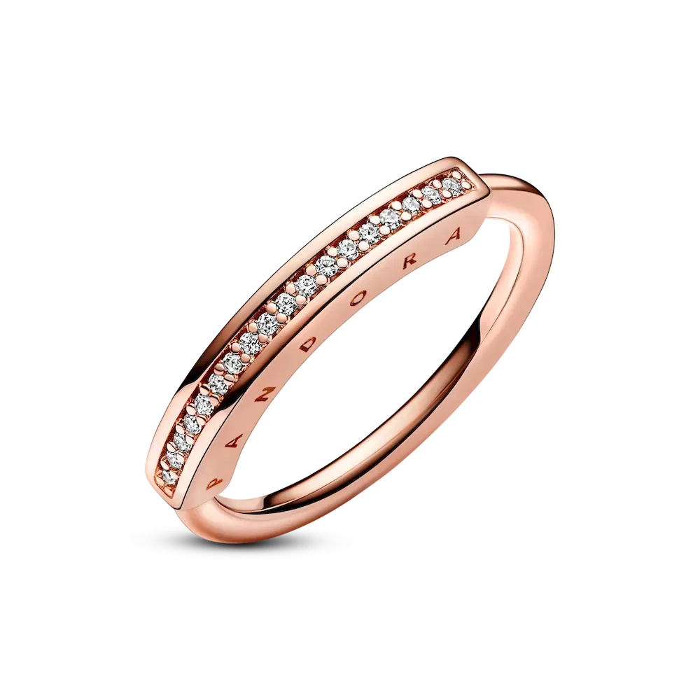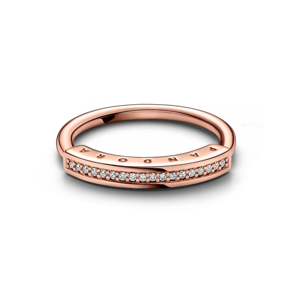 Add a touch of sparkling sophistication to your look with the Pandora Signature I-D Pavé Ring. Hand-finished with 14k rose gold plating, this architectural piece features an iconic round-and-square profile, complemented by a row of pavé. Wear it as an elegant statement piece or pair with the sterling silver version for an elevated stack.