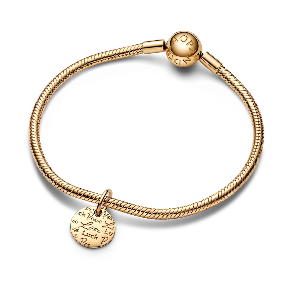 An emblem of peace, love and luck to carry with you always. This 14k solid gold charm features a round disc-shaped dangle with the engraved words