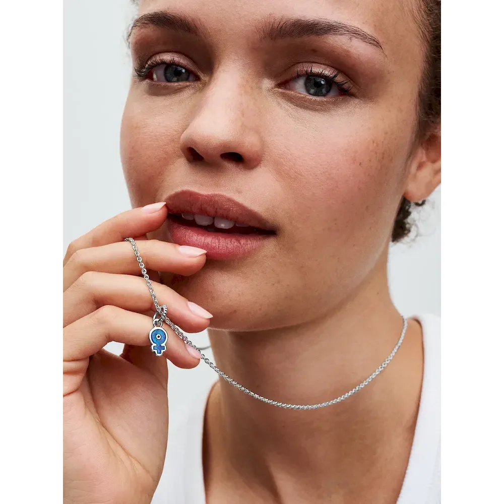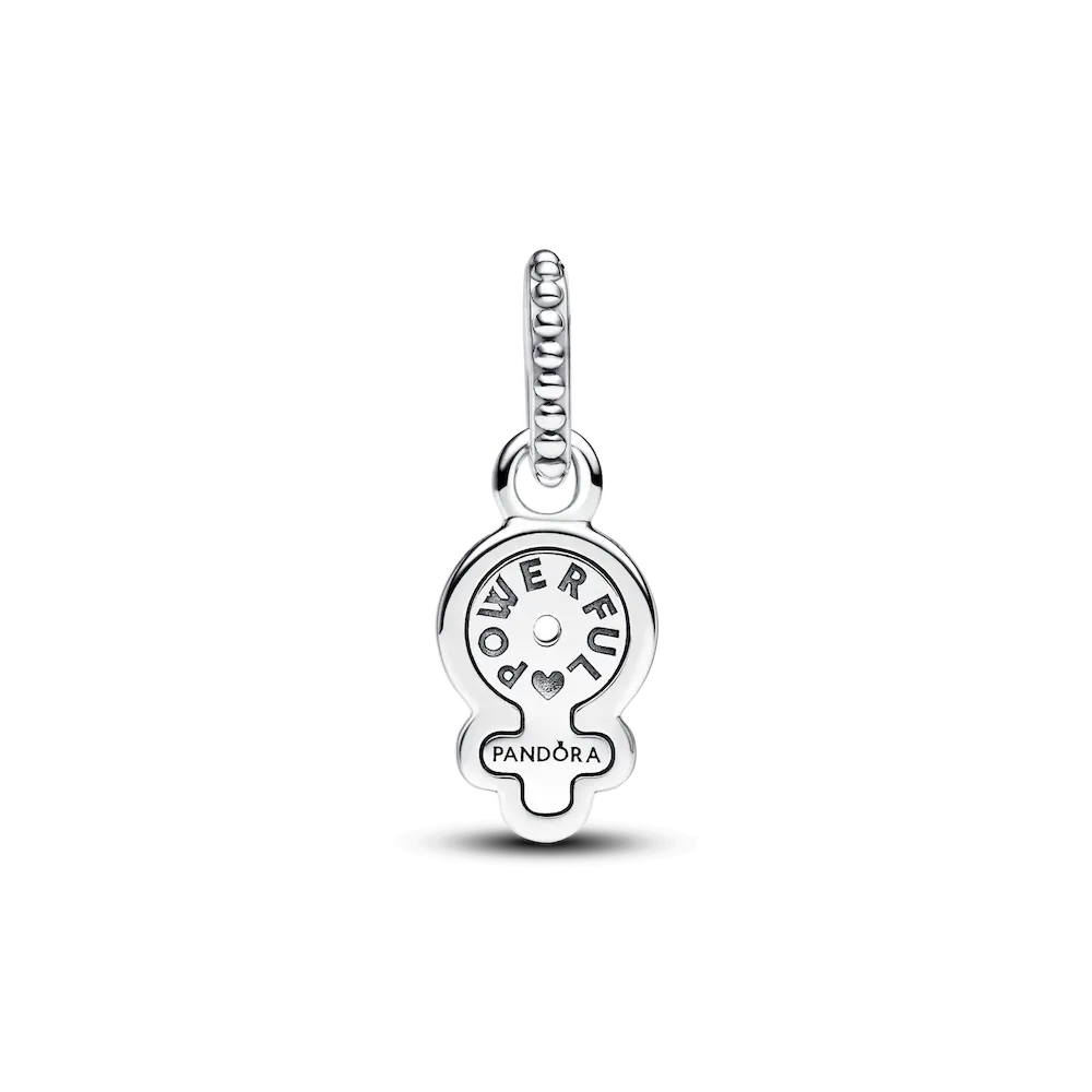 The Powerful Women Opalescent Dangle Charm features an opalescent female gender sign motif with a blue lab-created opal on one side and an intricate pattern on the other, this charm is inspired by female power.