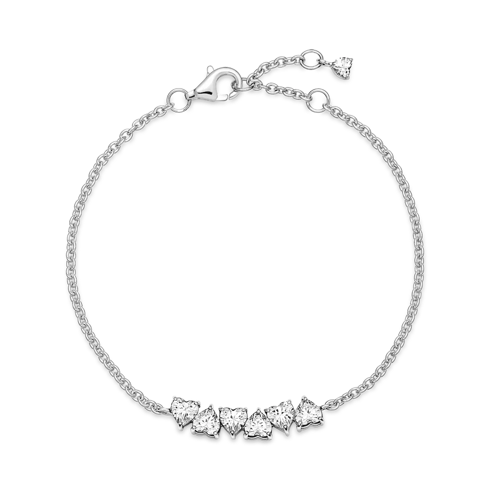 Fall in love many times over with the Sparkling Endless Hearts Chain Bracelet. This tennis bracelet-inspired design features six heart-shaped clear cubic zirconia set in alternating directions. A small heart-shaped stone dangles beside the lobster clasp to add extra sparkle. Wear it on its own or stack bracelets of different colors and metal finishes for a modern look.
