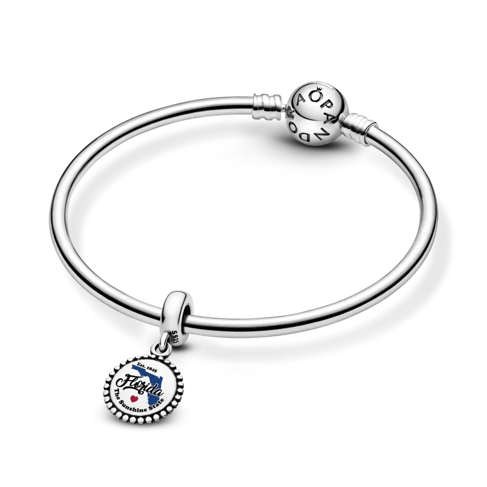 In a Sunshine State of mind. This sterling silver dangle charm features a state-shaped silhouette in glossy blue enamel with “Florida” beautifully scripted in black, and a small red heart underneath. Forever a reminder of your favorite place, perfect for styling on a favorite Pandora bracelet or necklace.