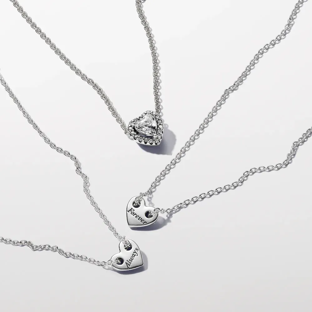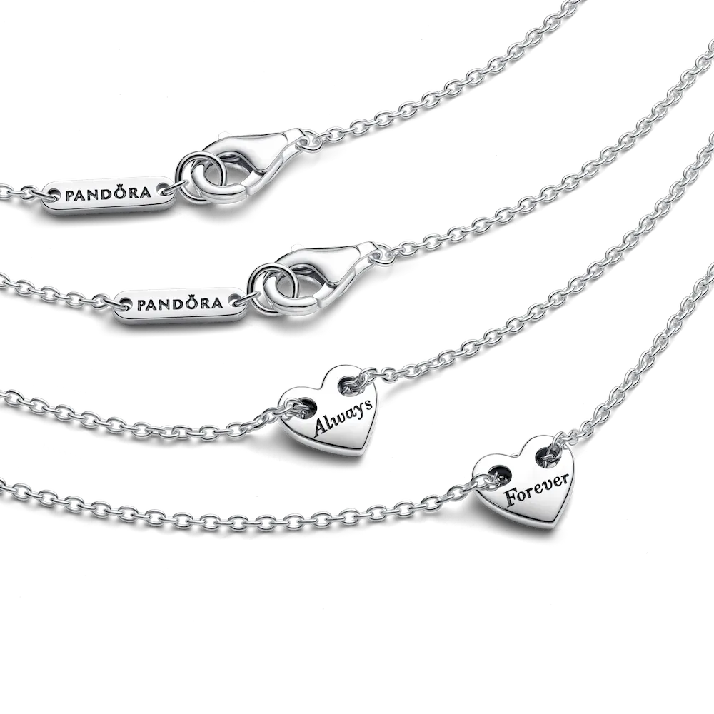 Keep eternal bonds close with our Forever & Always Splittable Heart Collier Necklaces. Crafted in sterling silver, each of the polished heart-shaped pendants are placed on an individual necklace and feature the sweet engravings