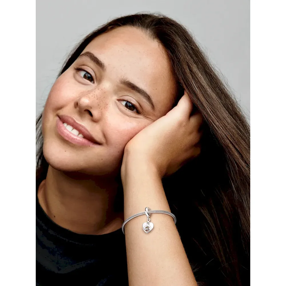 Discover a special charm for your BFF with the Friends Forever Heart Dangle Charm. Hand-finished in sterling silver, this heart-shaped dangle includes an asymmetric infinity sign cut-out with “Friends” in raised lettering on the front and the engraving “Forever” on the back. Another infinity sign connects the dangle with the bail, which features a sparkling clear stone. Let your bestie know that your friendship will last a lifetime with this piece.