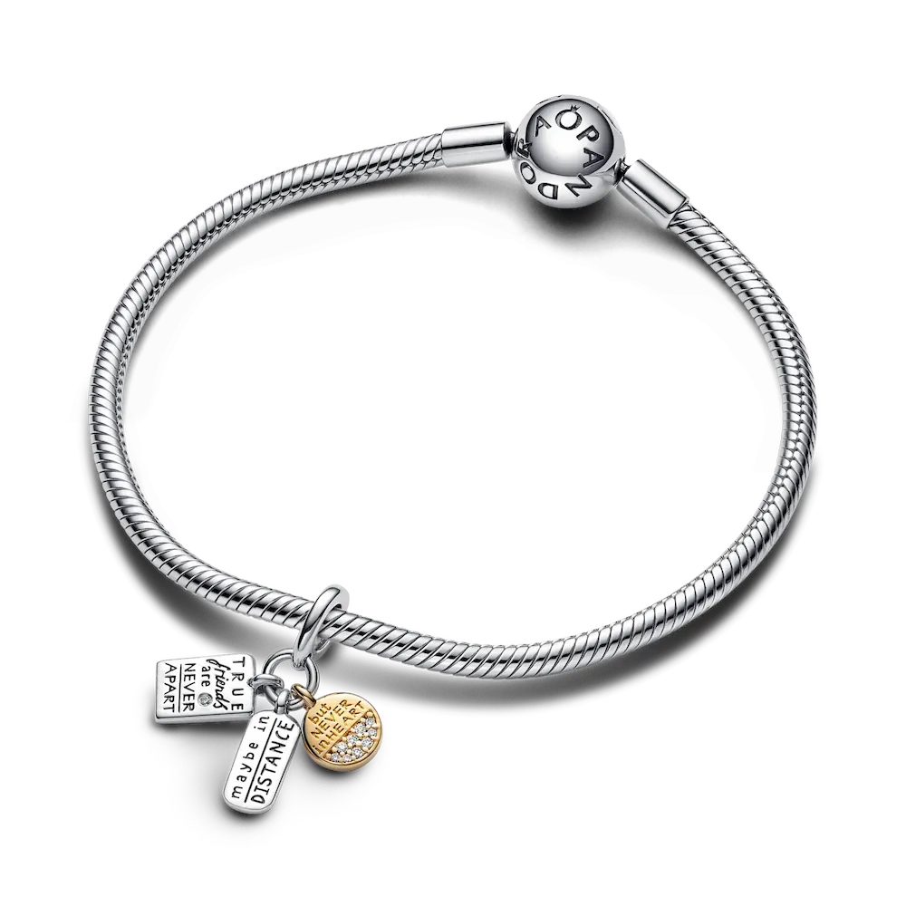 A tribute to your forever friends. This two-tone friends charm has three dangles, with engravings that read