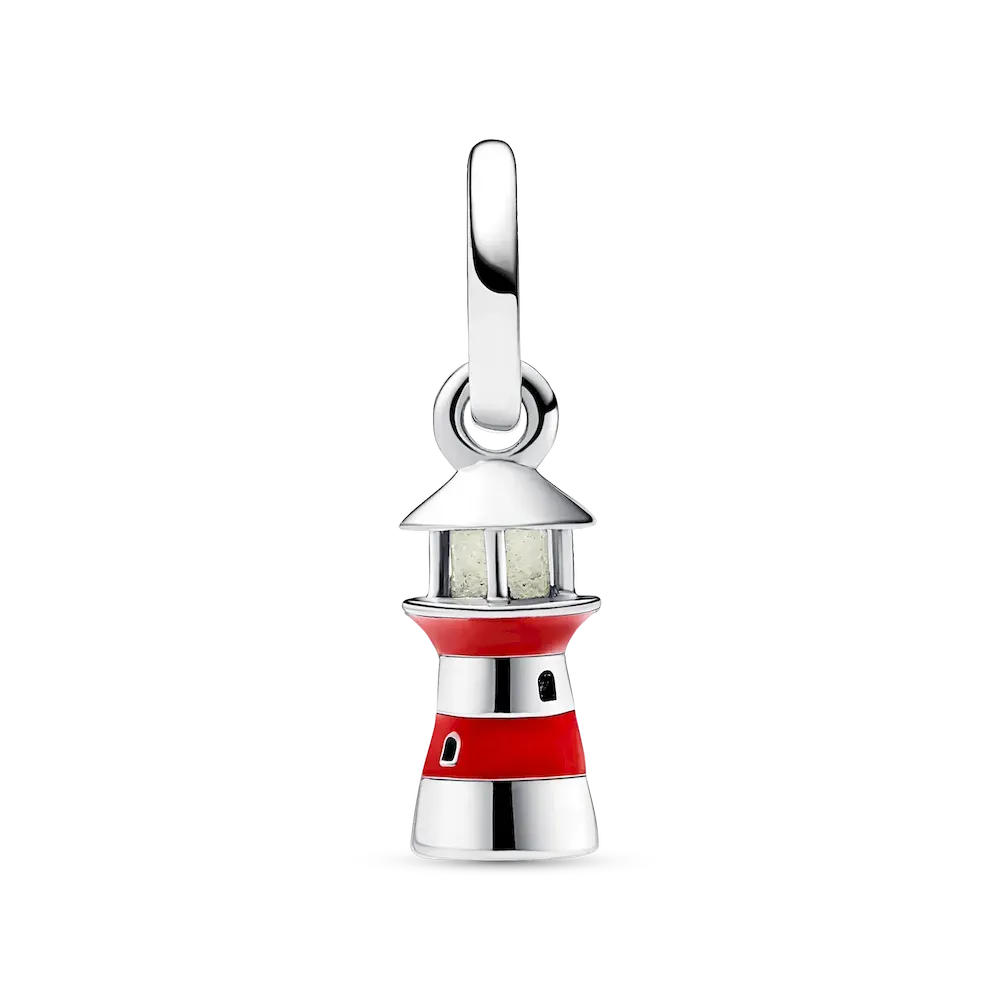 Shine bright wherever you are with the Glow-in-the-dark Lighthouse Dangle charm. Featuring hand-applied red enamel stripes and life-like lighthouse details including cut-out windows, a look-out spot as well as glow-in-the-dark glass in the windows and a cut-out heart at the bottom. Traditionally used to guide ships safely home in the night, the lighthouse is a reminder to stand firm and always be there for those in need. Style it together with your favorite Pandora charms for everyday guidance or gift it to someone that represents hope and safety in your life.