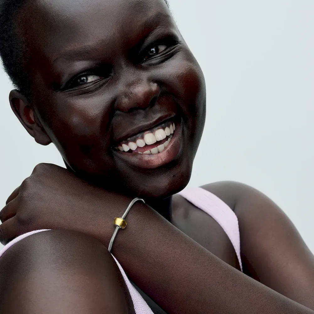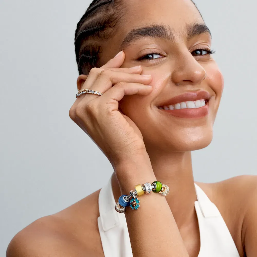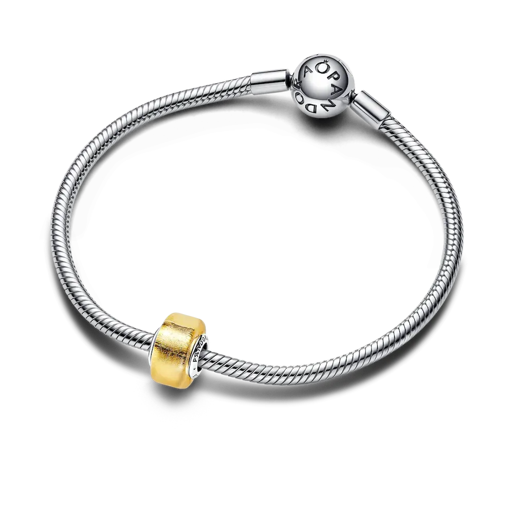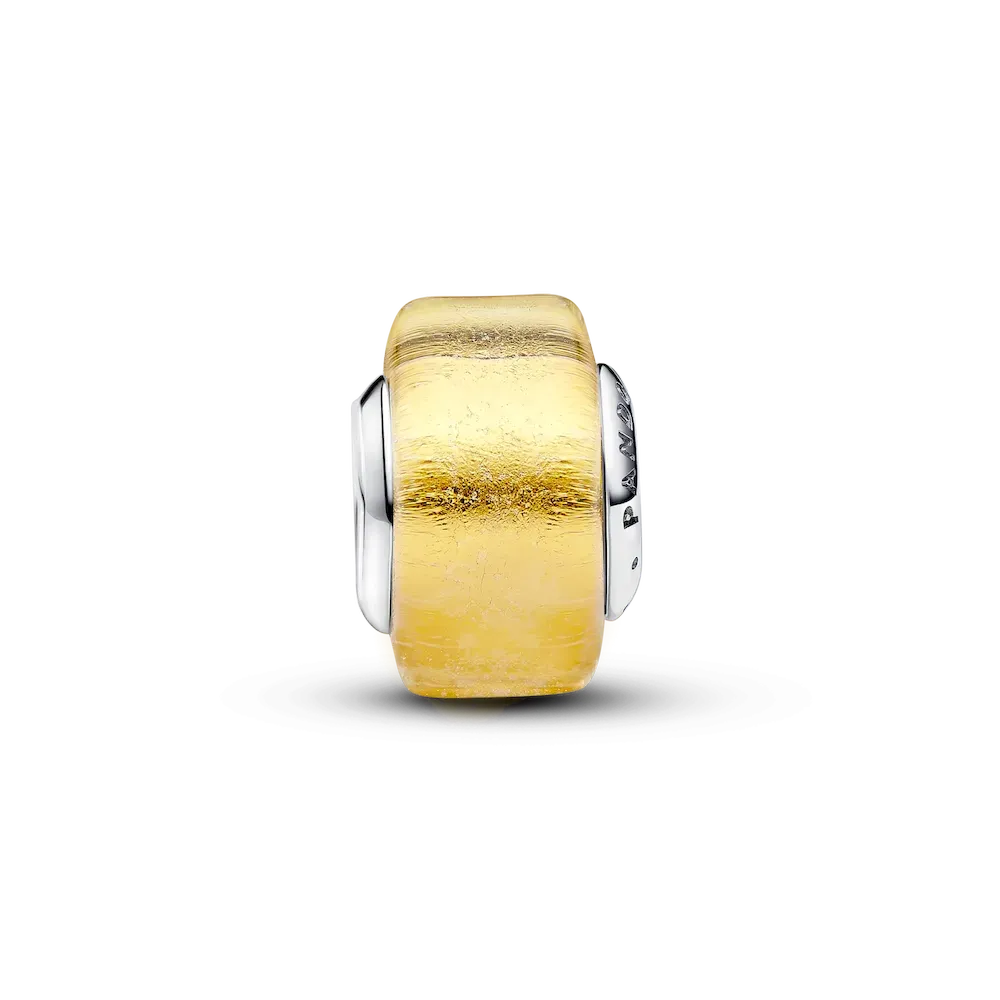 A classic design gets a golden-hued update in the Golden Mini Murano Glass Charm. Shining 24k gold foil is visible on the sterling silver core of this charm through transparent Murano glass, creating a two-toned effect. A Pandora logo is engraved on one side of the core. Designed in a slightly scaled-down size and with a squared profile, this charm is delicate and versatile, offering an effortless complement to any other metal tone you wear it with.