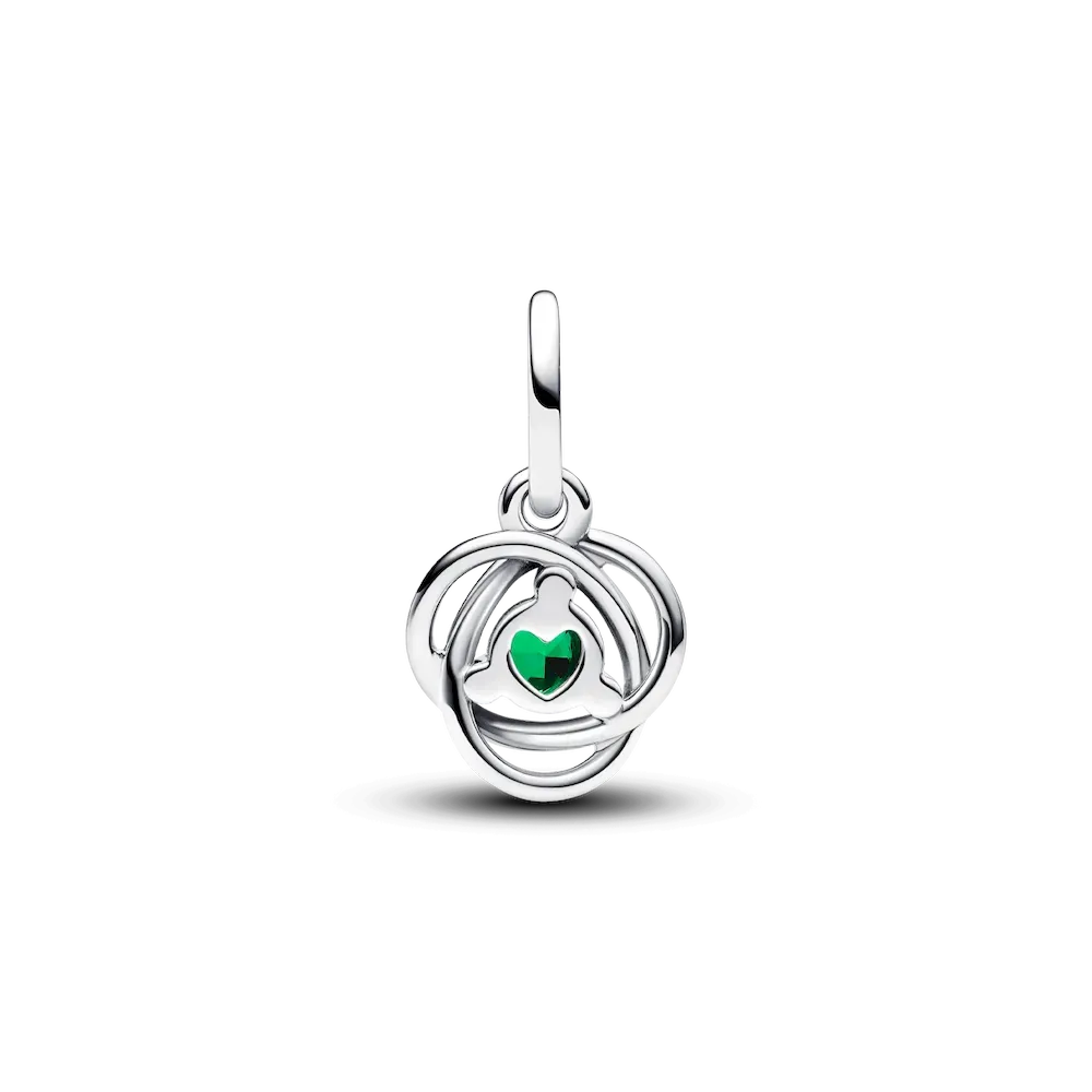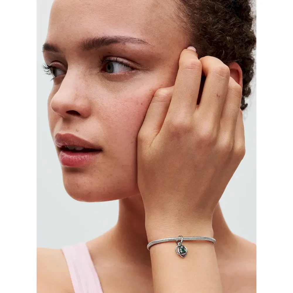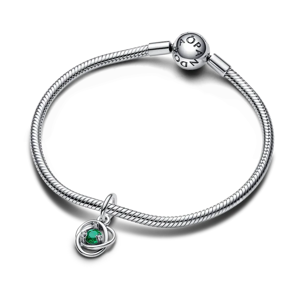 This intricate Green Eternity Circle Dangle Charm is a must-have infinity charm for your Pandora Moments collection. Crafted in lustrous sterling silver, it features an openwork infinity braid decorated with a central green manmade crystal, elegantly surrounded by three clear cubic zirconia. The intricate design symbolizes eternity and adds an additional layer of meaning to the piece. Elevate your bracelet with this timeless piece or gift it as a representation of an everlasting bond.