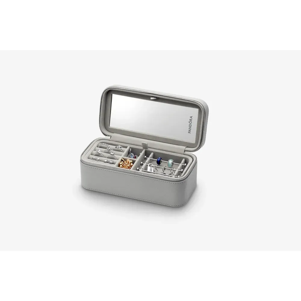 Introducing the perfect place to store your Pandora jewelry, crafted to organize and protect your favorite pieces and keep them safe. Our thoughtfully designed jewelry box has a textured PU exterior and separate velvet-lined compartments inside for storing different items of jewelry. The box features a removable top tray for your charms, rings and earrings, a flat insert for necklaces and a compartment underneath for bracelets. Two D-rings on the zip allow you to lock the box and a mirror inside the lid is handy for putting together your look each day. The perfect home for your treasured pieces or a thoughtful accompaniment to a sparkling gift. Jewelry not included.