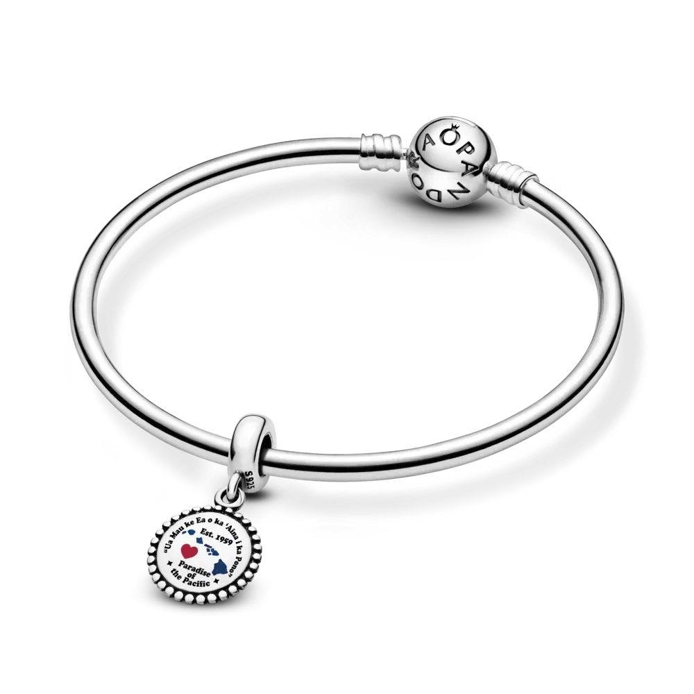 For the one who’s heart is in Hawaii. This sterling silver charm proudly displays the iconic state motto “Ua Mau Ke Ea O Ka ‘Aina I Ka Pono” above and “Paradise of the Pacific” below. The design also features a silhouette of the Hawaiian Islands in glossy blue enamel, accented with a red enamel heart.