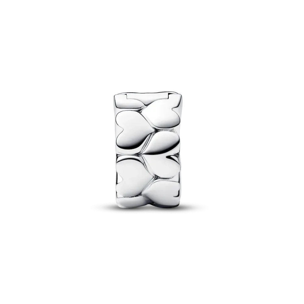 The Heart Pattern Clip Charm is a new addition to the Pandora Moments collection. This sterling silver charm features an endless pattern of alternating heart shapes that appear multi-dimensional. This clip-on heart charm has no silicone grip, so it will slide if not styled onto threads (two raised charm dividers). Give yourself – or someone special – a little love with a sterling silver clip charm as a reminder of your special bond.