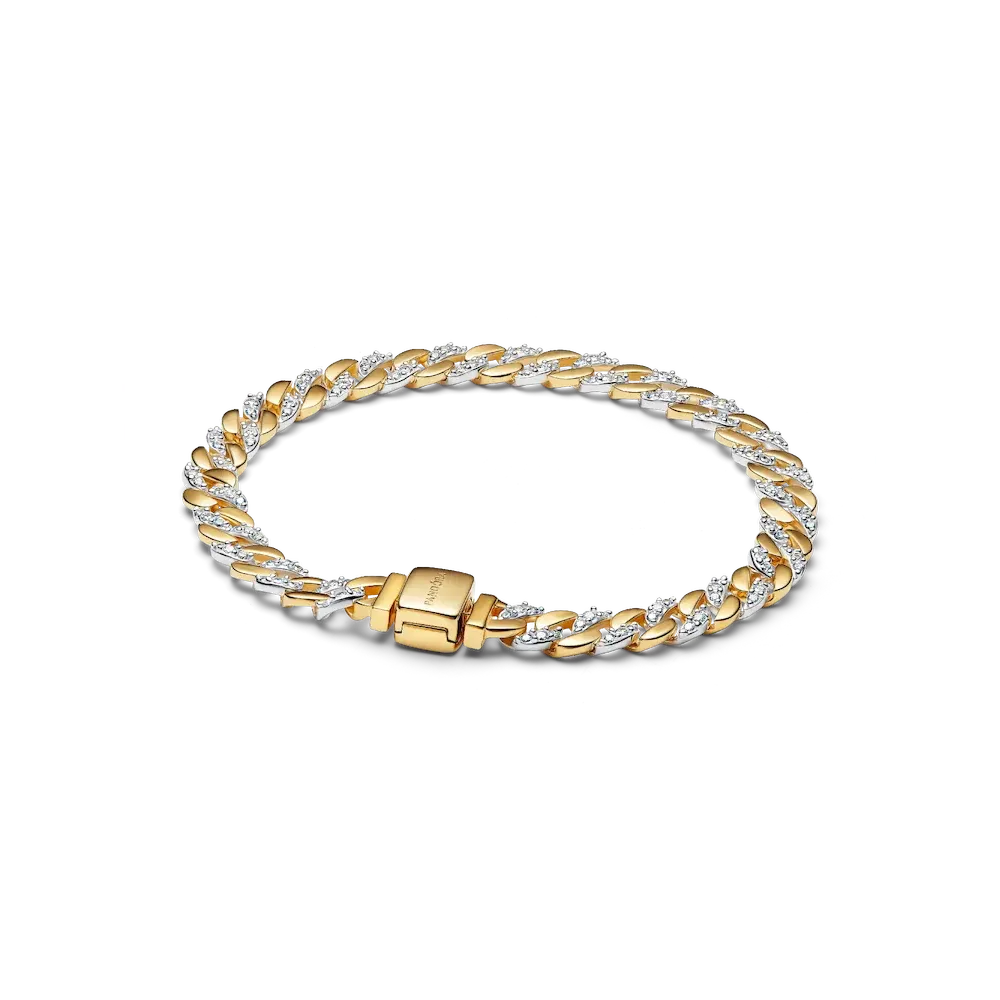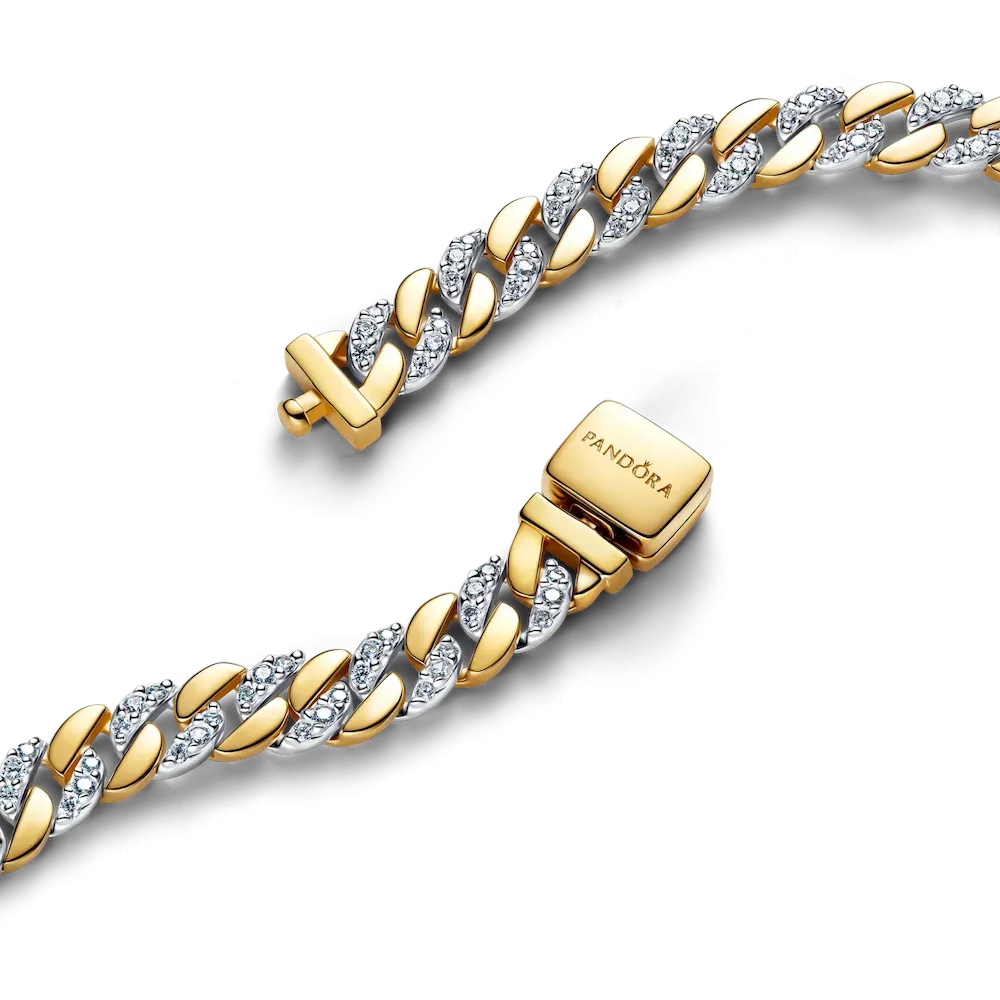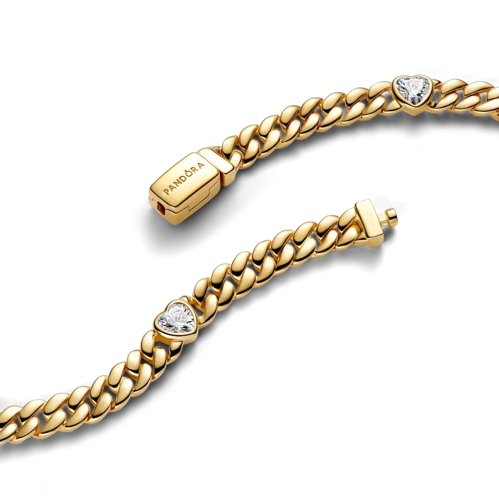 One for you, one for them. This set features two of our bestselling 14k gold-plated Cuban chain bracelets. One is set with heart-shaped stones and the other is crafted with a mixed-metal chain and sparkling pavé.