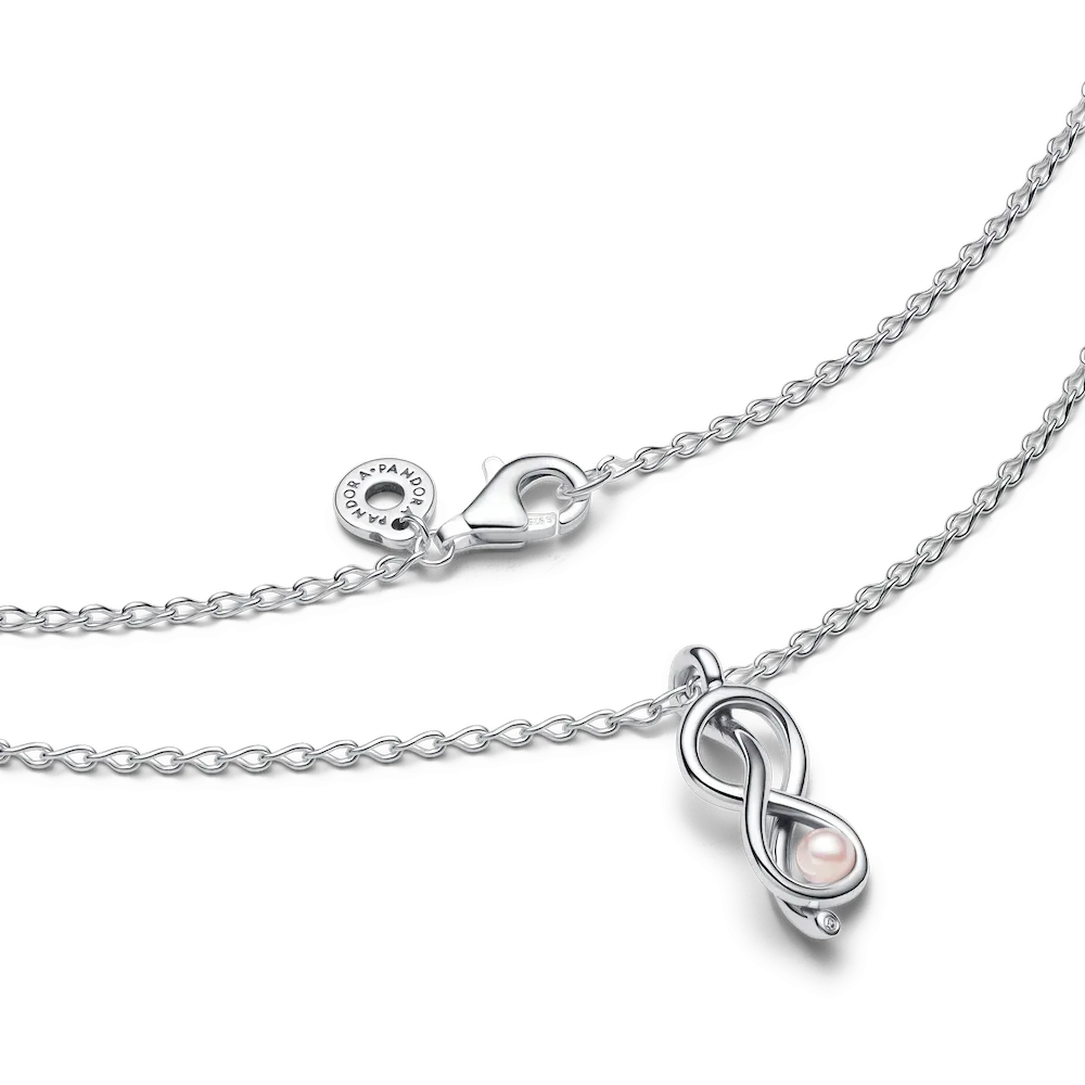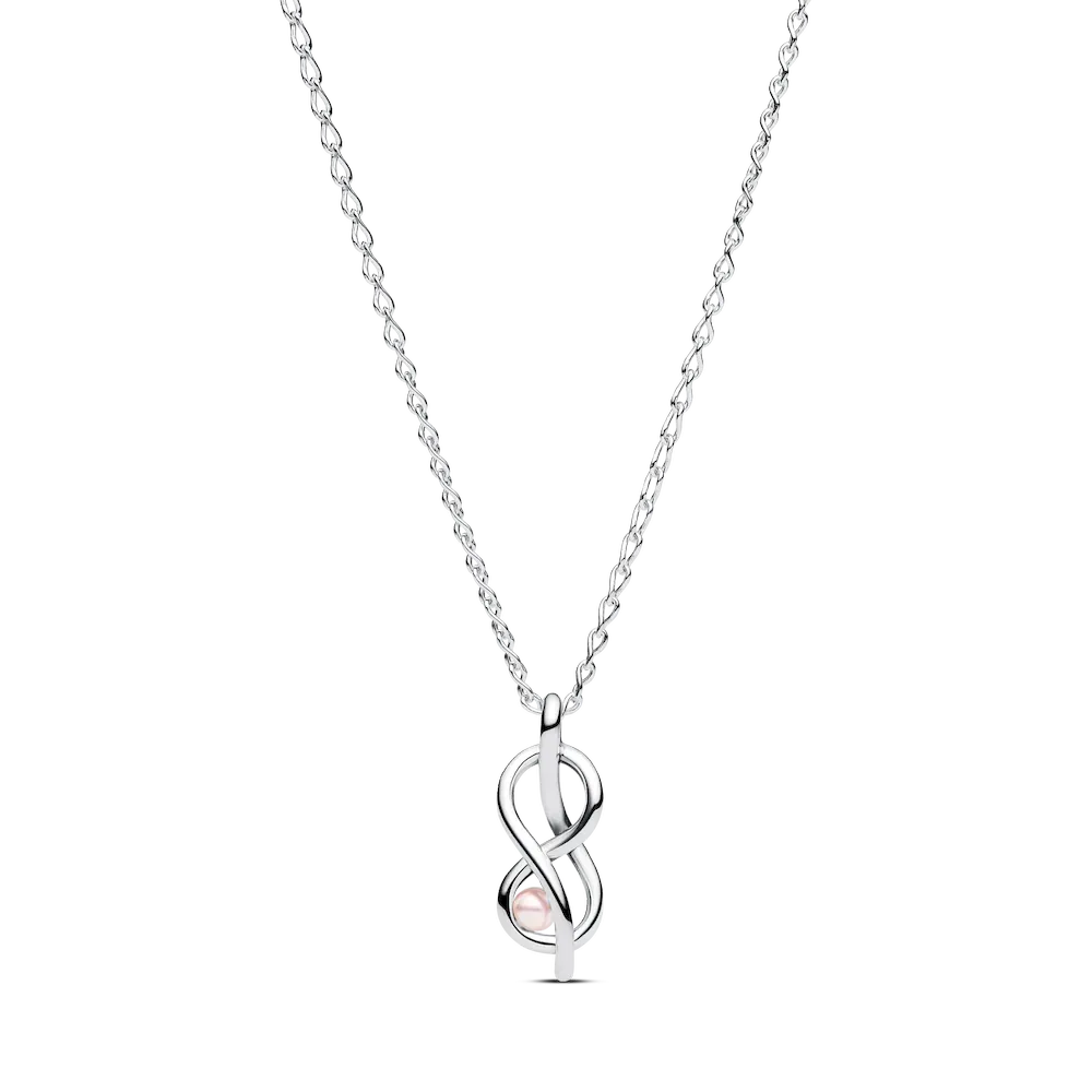 Bring a pop of pink to your neckline with the Infinity Knot Collier Necklace. This sterling silver necklace features a pink lacquered artificial pearl nestled inside an infinity knot symbol, which is set with sparkling stones at each end. Slide the pendant on the chain to adjust the length. Elegant yet irreverent, the pink pearl adds just enough color to liven up any look – but can also function as a versatile neutral.