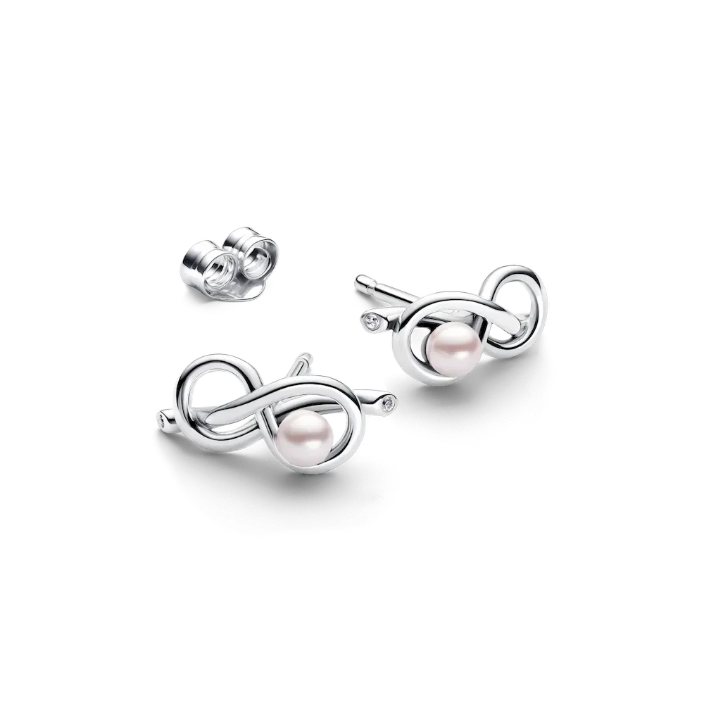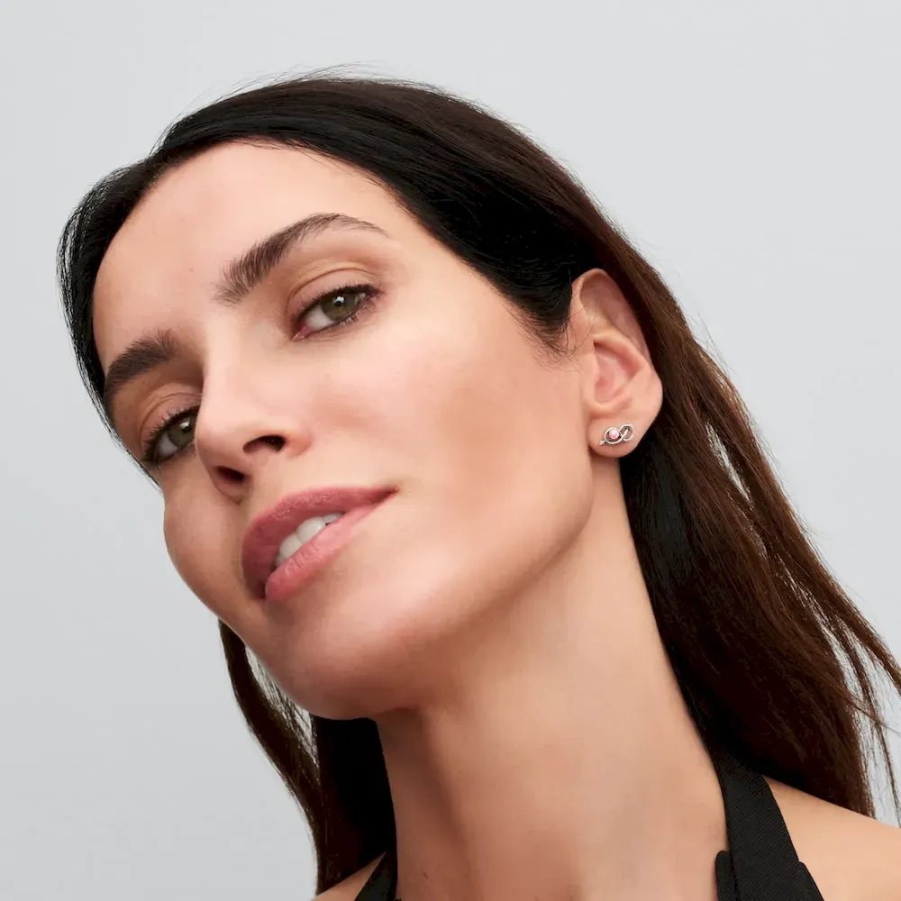 Bring a pop of pink to your ears with the Infinity Knot Stud Earrings. These sterling silver earrings feature pink lacquered artificial pearls nestled inside infinity knot symbols, which are also set with sparkling stones at each end. Elegant yet irreverent, the pink pearls add just enough color to liven up any look – but can also function as a versatile neutral. Like all our infinity knot–inspired jewelry, these earrings symbolize everlasting love and interconnectedness.