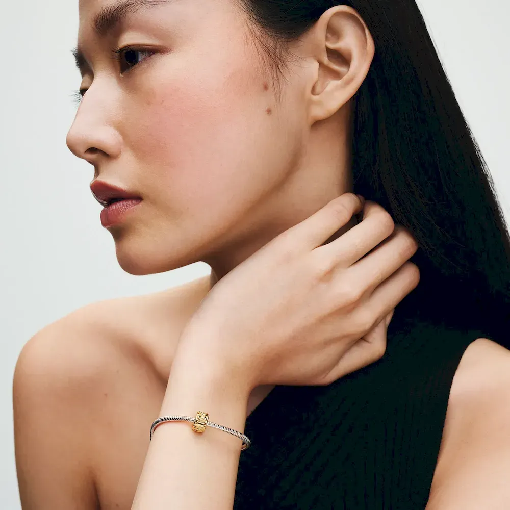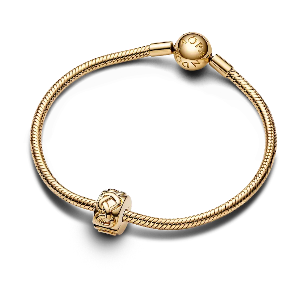 Our simple yet striking Pandora Moments clip charm is decorated with a row of knotted hearts. The design features a combination of the iconic heart and the classic love knot, which gives the piece extra emotional appeal. The 14k gold-plated charm is perfect for adding a heartfelt touch to your bracelet collection and helps to evenly space out your stack. This clip charm features no silicone grip, so it will slide if not styled onto threads (two raised charm dividers).