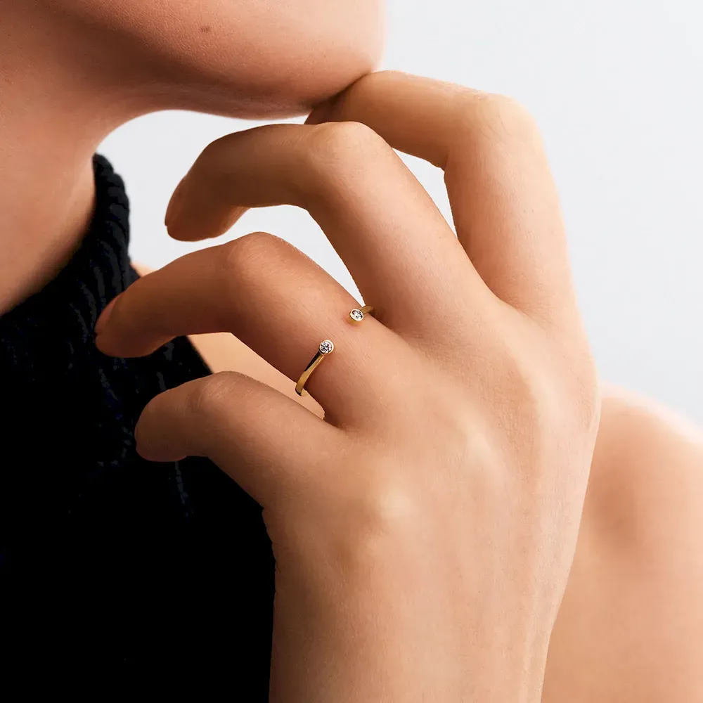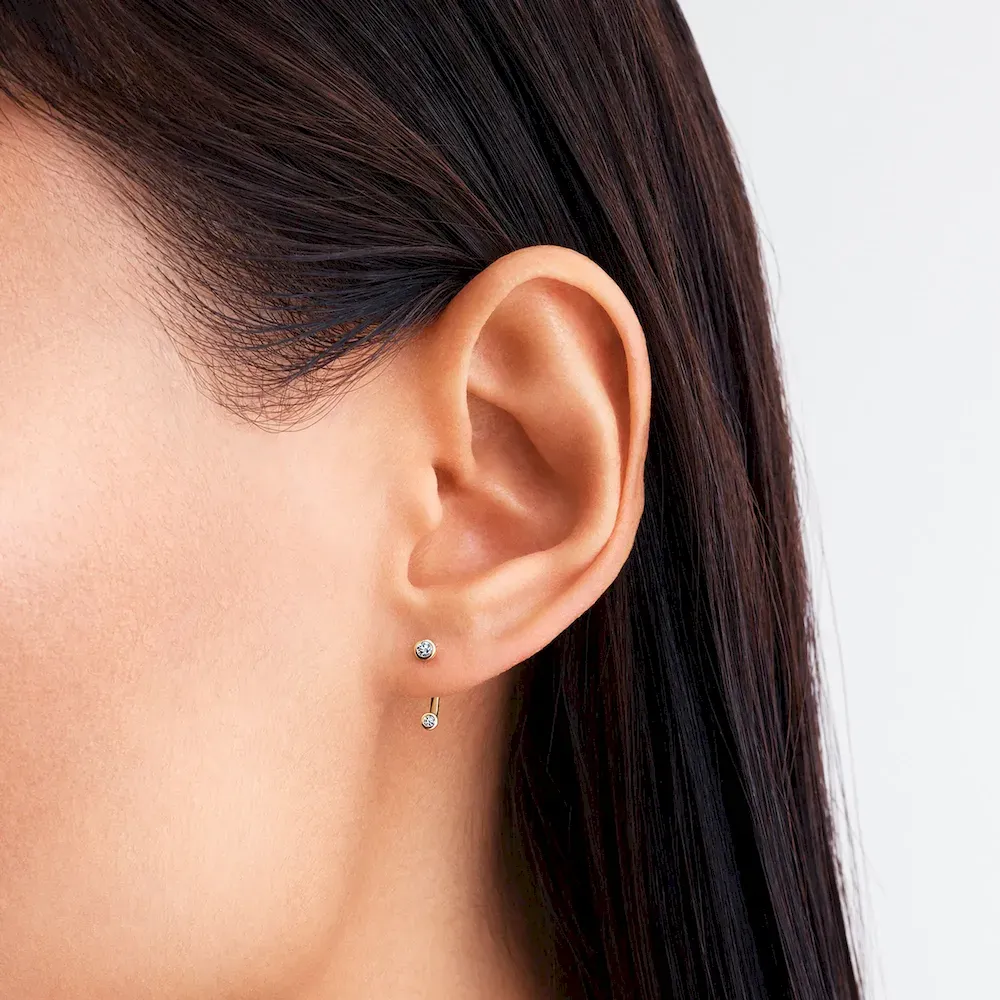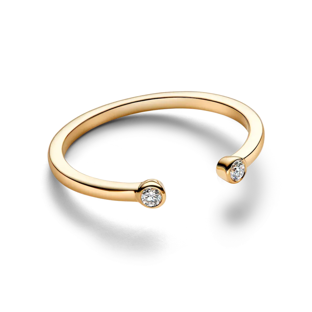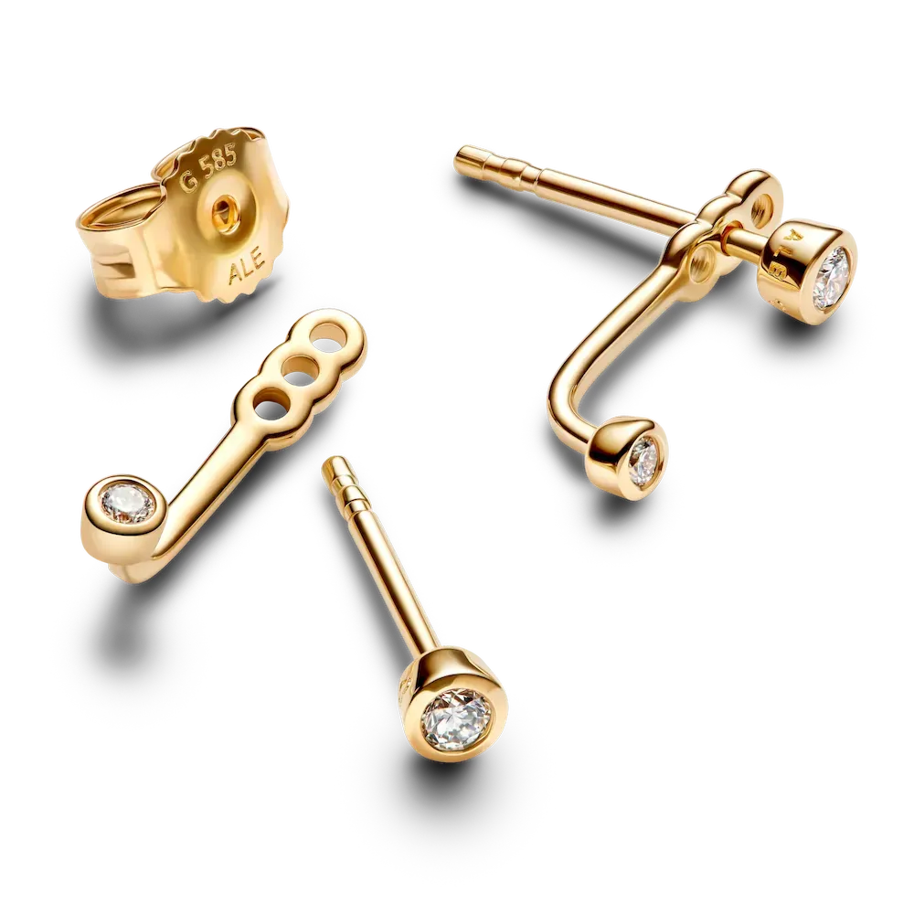 The Lab-Grown Diamond Open Earring and Ring Set combines innovation with elegance. The earrings feature adjustable earring jackets with two bezel-set lab-grown diamonds (0.10ct TW), one on the stud and one at the end of the jacket. Choose your preferred length from three options to customize your look. The stacking ring is crafted from solid 14k gold, featuring two bezel-set lab-grown diamonds on each end of the open band. With a minimalist aesthetic, it’s perfect for layering with other Pandora Era rings. This set brings together timeless beauty and modern design for a chic, personalized touch.