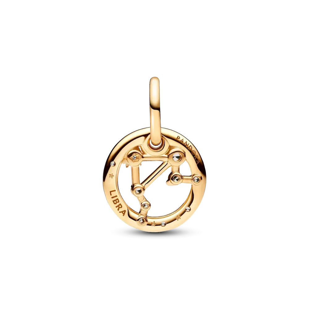 Let the stars guide your look with the Libra Zodiac Dangle Charm. The Pandora Moments dangle charm is crafted our 14k gold-plated unique metal blend, has a circular outer frame and features clear sparkling cubic zirconia as well as the shape of the Libra zodiac sign. The back side of the frame is engraved with