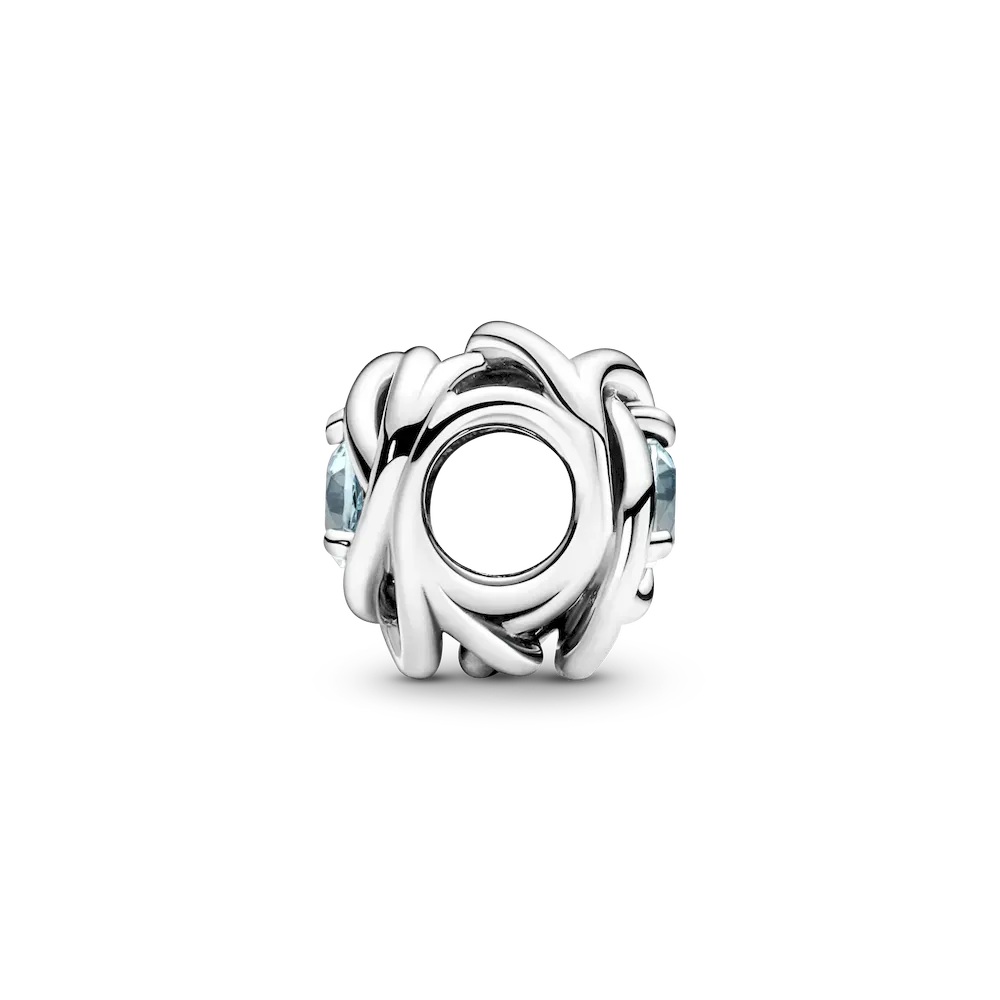 Celebrate March milestones with the Sea Aqua Blue Eternity Circle Charm featuring a man-made crystal reminiscent of the deep sea with a sterling silver infinity braiding pattern. The charm comes on a snake-chain patterned Pandora Moments Small O Pendant on a Classic Cable Chain Necklace in sterling silver.