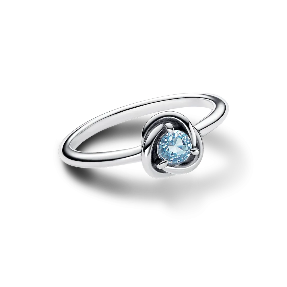 Wear a symbol of forever with the Sea Aqua Eternity Circle Ring. This sterling silver ring features one claw-set sparkling blue man-made crystal. The polished band wraps around the center stone in an openwork braided infinity pattern. Whether you want to carry a reminder of eternal love or a symbol of the timeless joy that infuses each and every moment, this colorful eternity ring will bring sparkling meaning to your look.