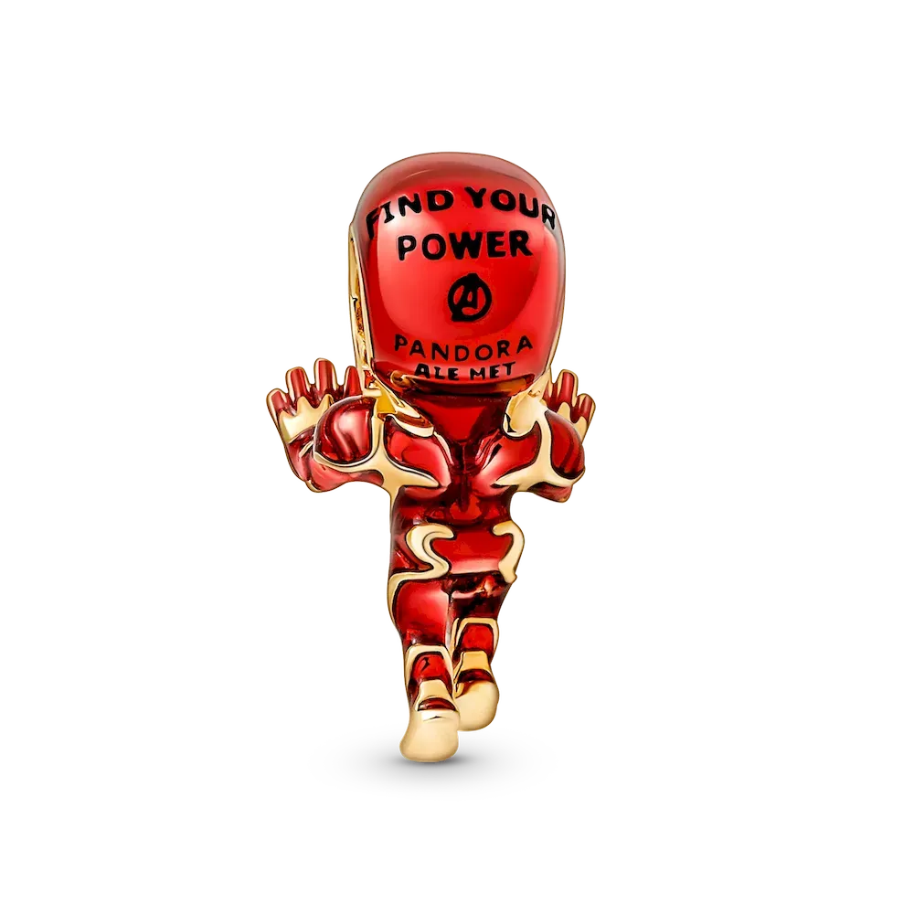 Iron Man saves the day in a 14k gold-plated charm, with white, black and transparent red enamel accented by two round cubic zirconia stones in each of his palms. At the center of his chest, you’ll find a white enamel-filled heart-shaped arc reactor heart giving him life, with an inspiring message, “FIND YOUR POWER,” on his back, along with the The Avengers logo. This charm is carried on a sleek 14k gold-plated Pandora Moments Snake Chain Bracelet.