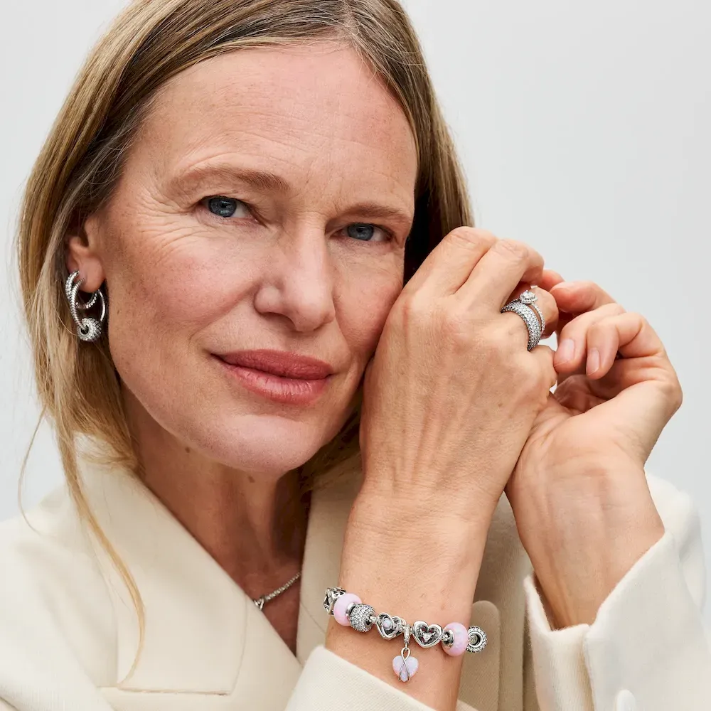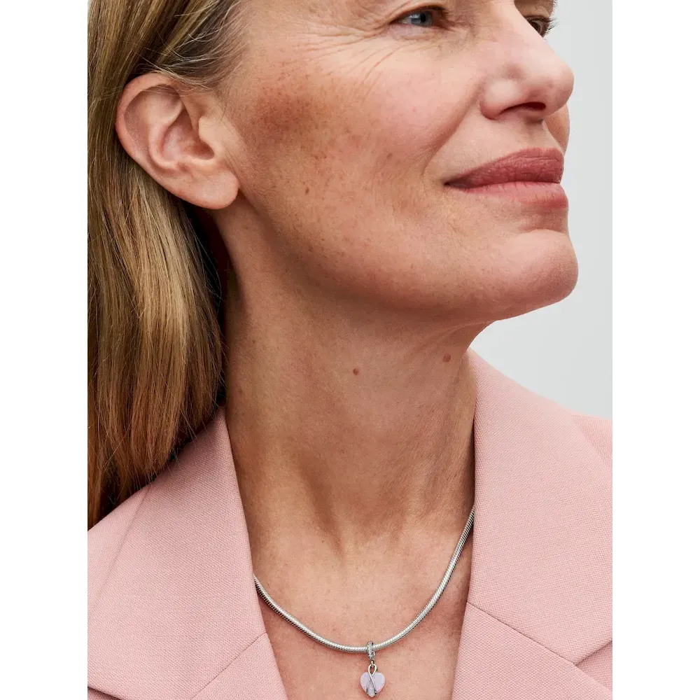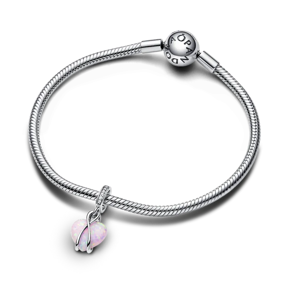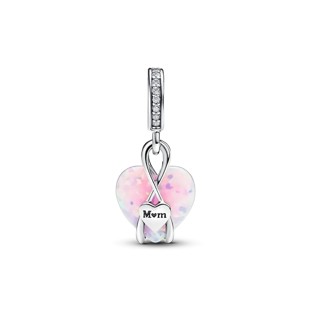 Celebrate your mom with the Pandora Mom Opalescent Heart Dangle Charm. Crafted in sterling silver, this heart-warming charm features a heart-shaped pink lab-created opal, adorned with a spectrum of colors and glittering streaks. The intricate design features overlapping silver lines forming a jump ring, a delicate heart-shaped disc engraved with ‘Mom,’ and a row of pavé for added shine. Celebrate the beauty of motherhood with a charm that captures its richness and multi-faceted stories.