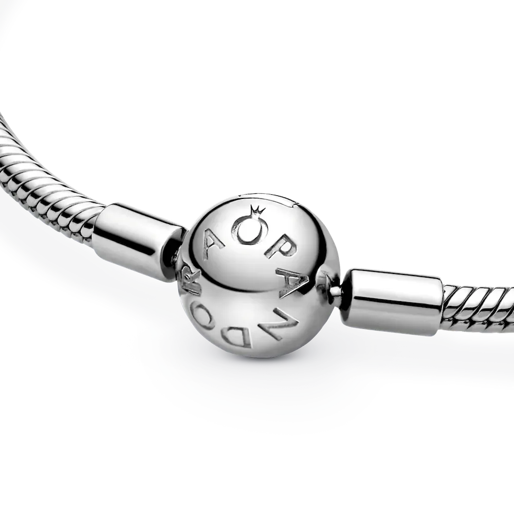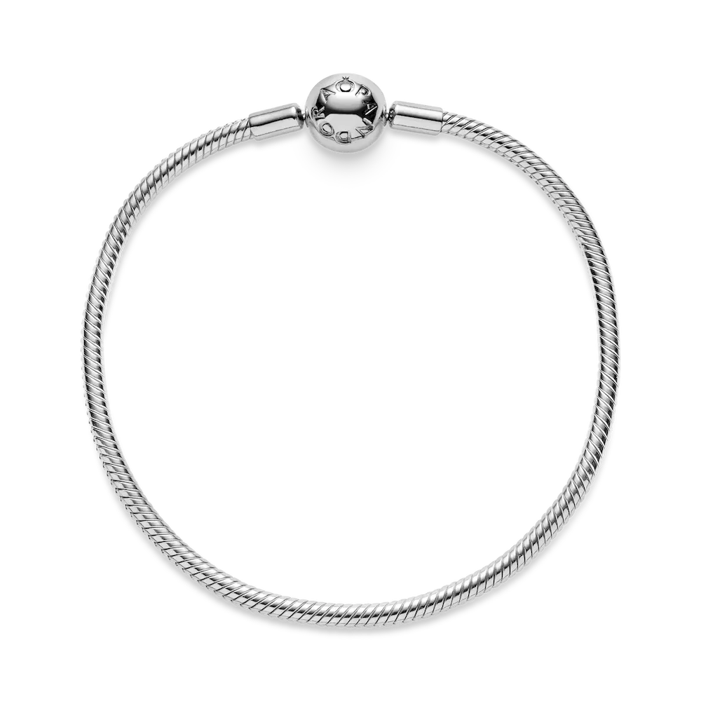 Start your very own Pandora story with this sleek snake chain bracelet in polished sterling silver. The perfect canvas for your creativity, this hand-finished bracelet can be styled in countless ways. Fill it with your desired charms and clips, wear it on its own for a simple, understated look, or stack it with contrasting bracelets for a fun play on textures. Only silicone-lined safety chain clips will fit this Moments bracelet.