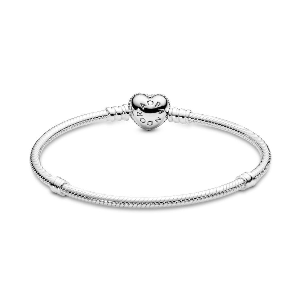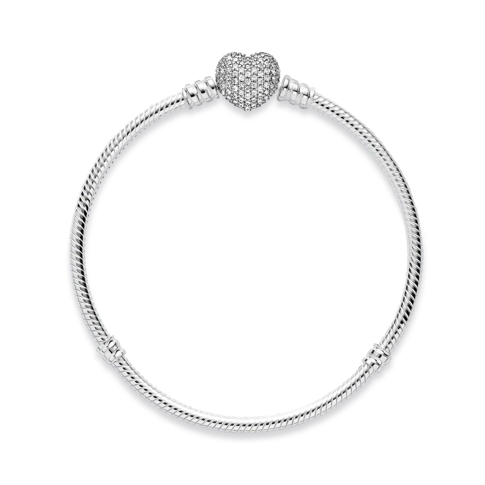 Add sparkle and romance to your charms with this stunning version of Pandora’s iconic snake chain bracelet. Hand-finished in sterling silver, this sleek style features a reversible heart-shaped clasp set with shimmering pavé stones on one side and embossed with the Pandora logo on the reverse. Simply turn the clasp to create two different looks. Wear this bracelet unadorned or filled with your favorite Pandora charms.
