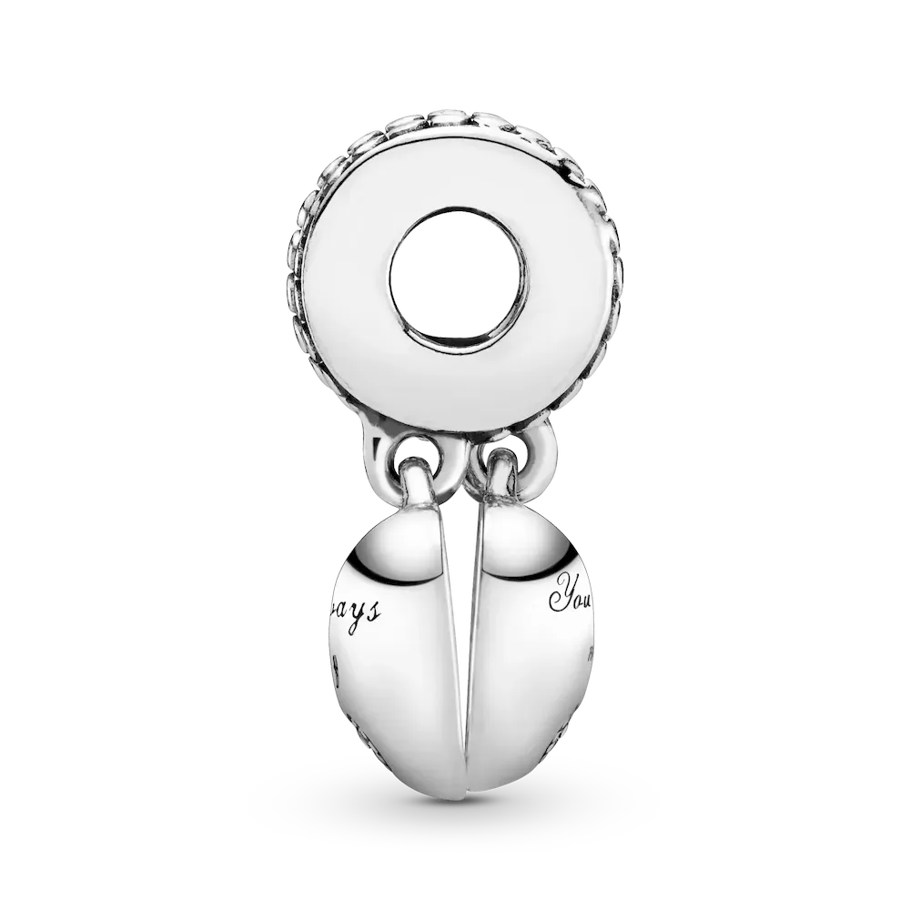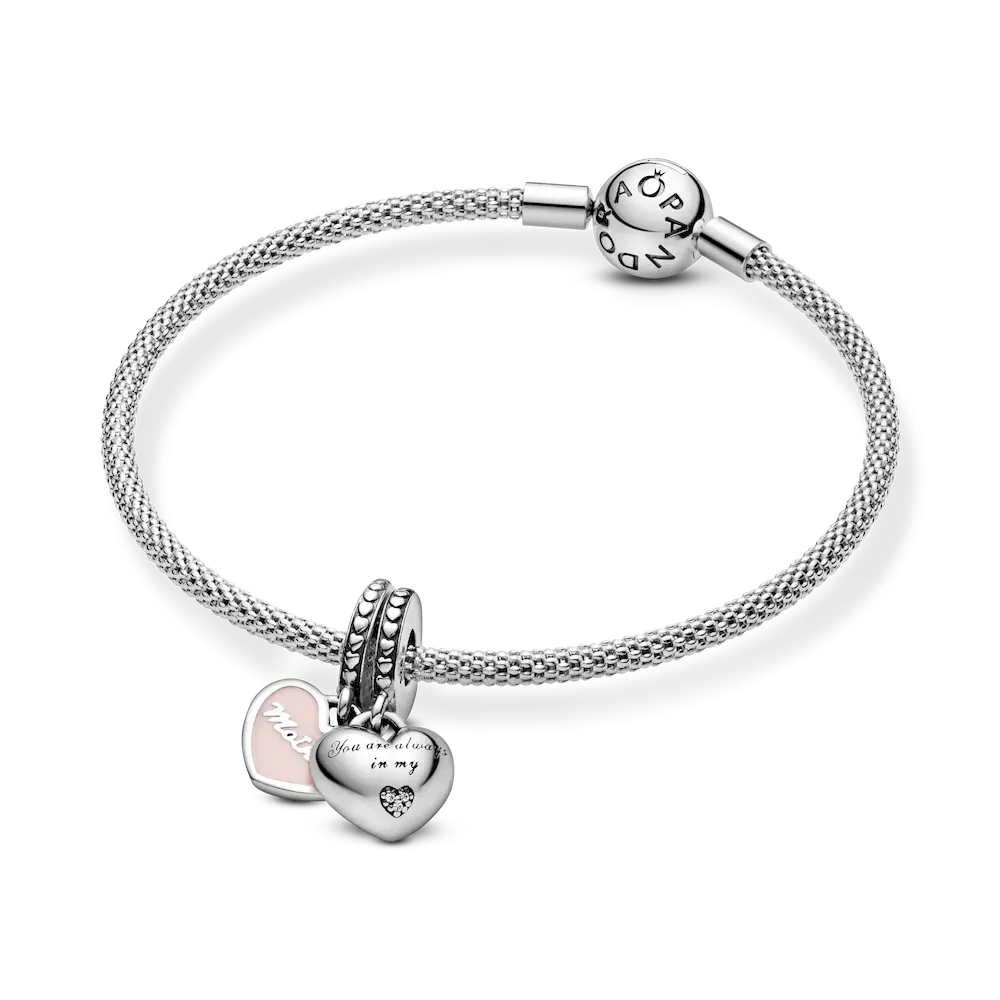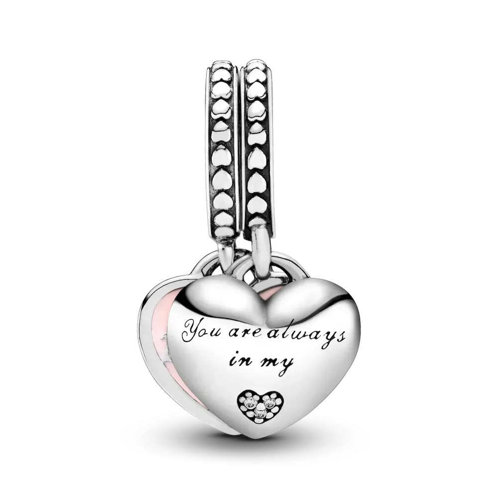 Celebrate the special bond between mother and daughter with this pretty split pendant charm. Crafted in polished sterling silver, it is hand-finished with delicate pink enamel and the words “you are always in my” with a sparkling cubic zirconia heart. This Pandora mother and daughter charm comes as two halves – allowing you to wear one half each or create a beautiful love heart by joining the two halves together. A memorable Mother’s Day gift idea.