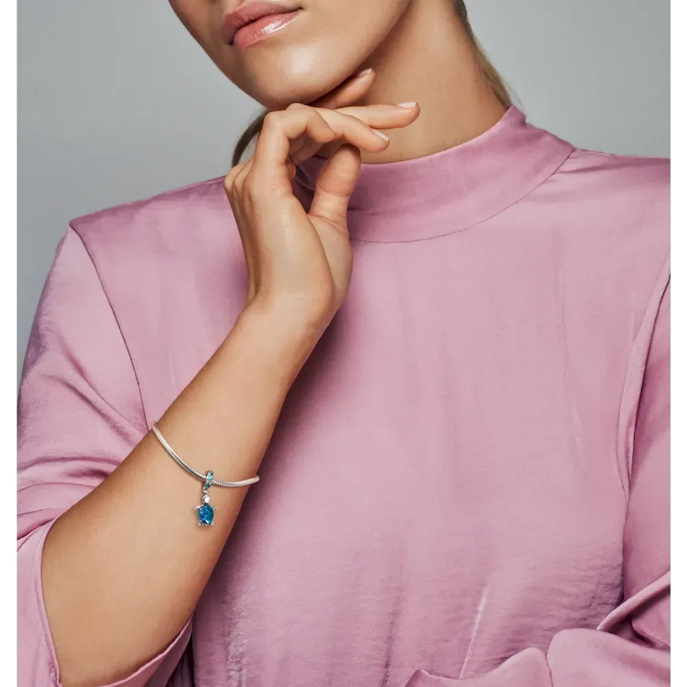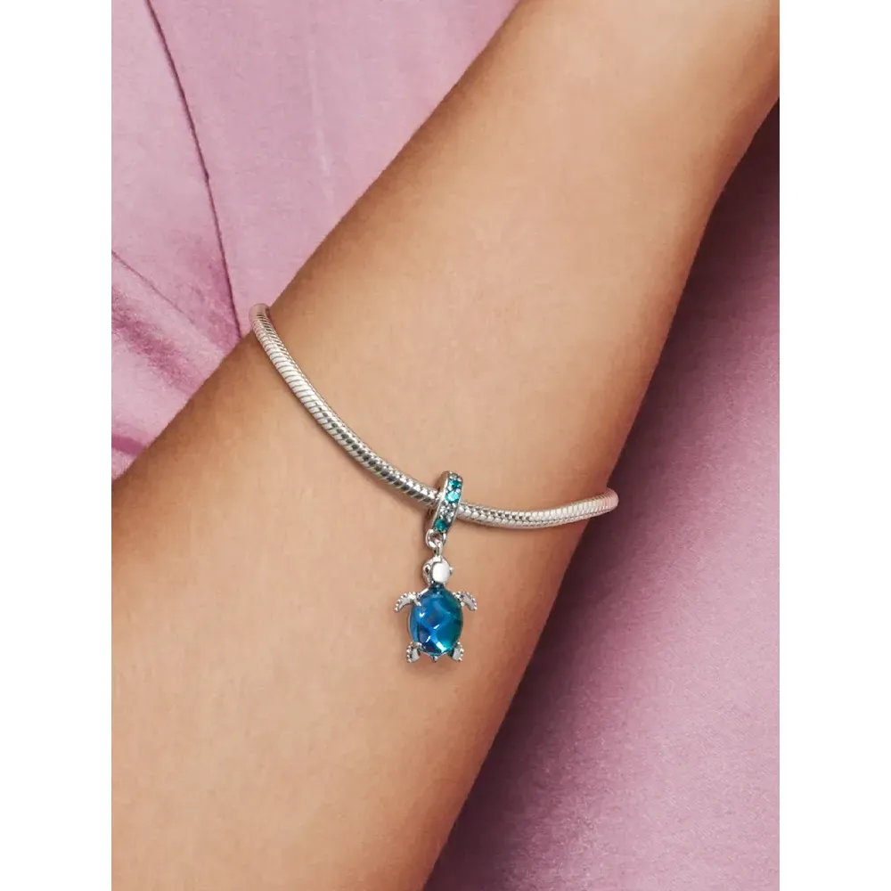 The Murano Glass Sea Turtle Dangle Charm is inspired by the peaceful creatures of the deep blue sea. The sea turtle charm features bleached aqua blue crystals, icy green crystals and a single peacock Murano glass bead. The sterling silver cut-out pattern on the belly of the turtle features a heart and shines through the Murano glass to create a beautiful scale-like effect that dances with the light.