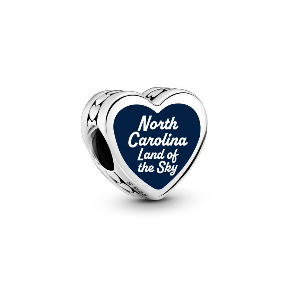 Take your love for North Carolina to new heights. Crafted in sterling silver, one side of this heart-shaped charm captures a scenic view of the iconic Wright brothers’ plane soaring through clear skies. The other side features “North Carolina Land of the Sky” beautifully scripted in white on dark blue enamel. Let its rich history and natural beauty lift your spirits every time you wear it.