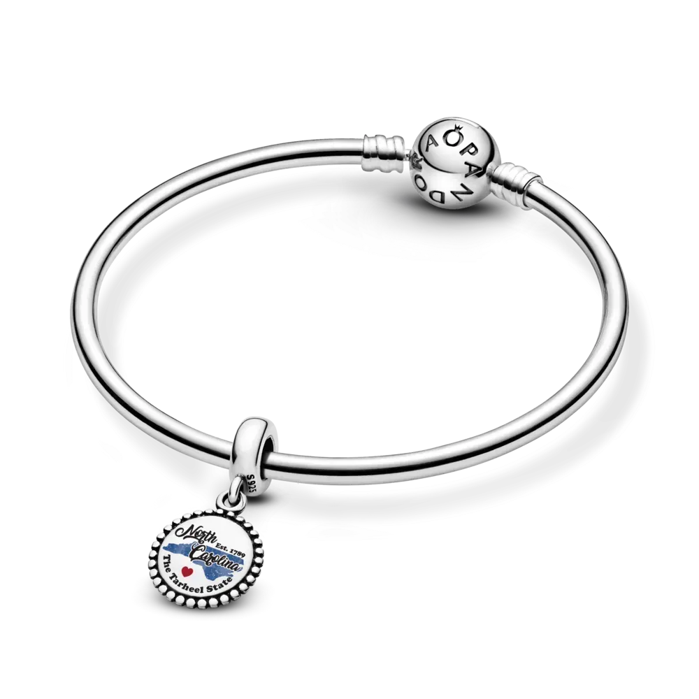 A symbol of Tarheel State pride, this sterling silver dangle charm features a state-shaped silhouette in glossy blue enamel with “North Carolina” beautifully scripted in black, and a small red heart underneath. Whether you’re celebrating your hometown or it’s a place you dream to visit, add a piece of North Carolina spirit to your style.
