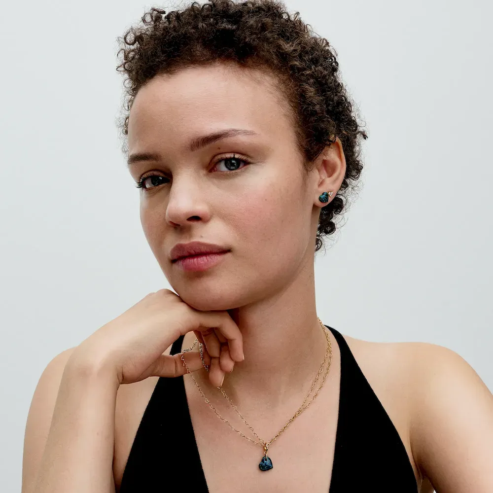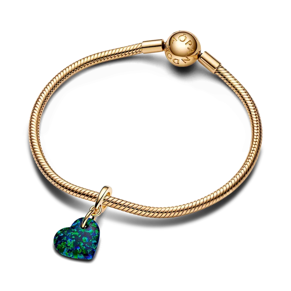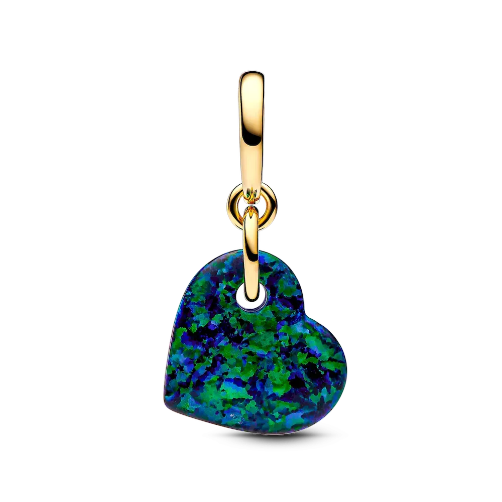 Channel the heart of the jungle with the Opalescent Green Heart Dangle Charm. A lab-created, heart-shaped iridescent opal features a spectrum of colors and streaks of glitter designed to evoke the vivid colors of the tropics. The heart hangs from an angle from a 14k gold-plated jump ring and pear-shaped bail. Pair this vibrant charm with other warm-toned styles to create a rich focal point and remind yourself of the wild, free-spirited energy of nature and summer.
