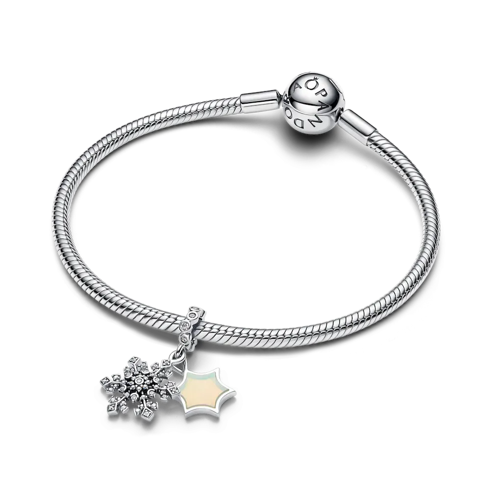 Channel winter wonder in sterling silver. This charm pairs a sparkling snowflake with a shimmering star featuring aurora lab-grown opal resin on one side and the engraving ‘I MELT FOR YOU’ on the other.