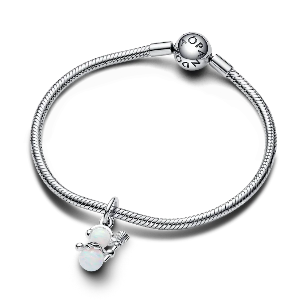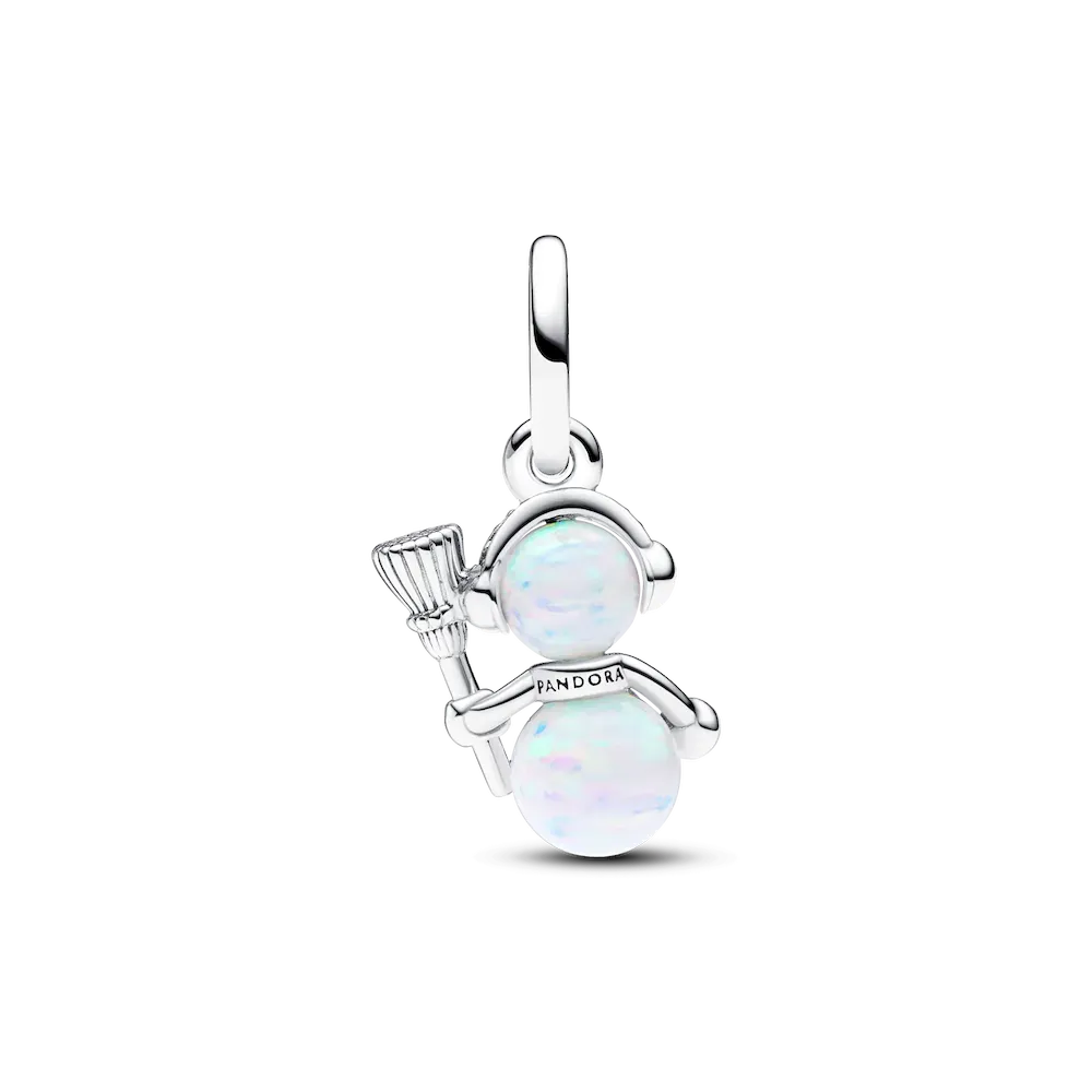 Add a festive glow to your jewelry with the Opalescent Snowman Dangle Charm. Be reminded of the beauty of snowy days spent building and decorating snowmen with this new Pandora Moments charm. Crafted from two shimmering lab-created opals, this sterling silver dangle charm features playful details like a pavé scarf, a grooved broom and ear-warmers with microbead details. Gift it to the one you’d build a snowman with, or wear it to bring holiday cheer to any look.