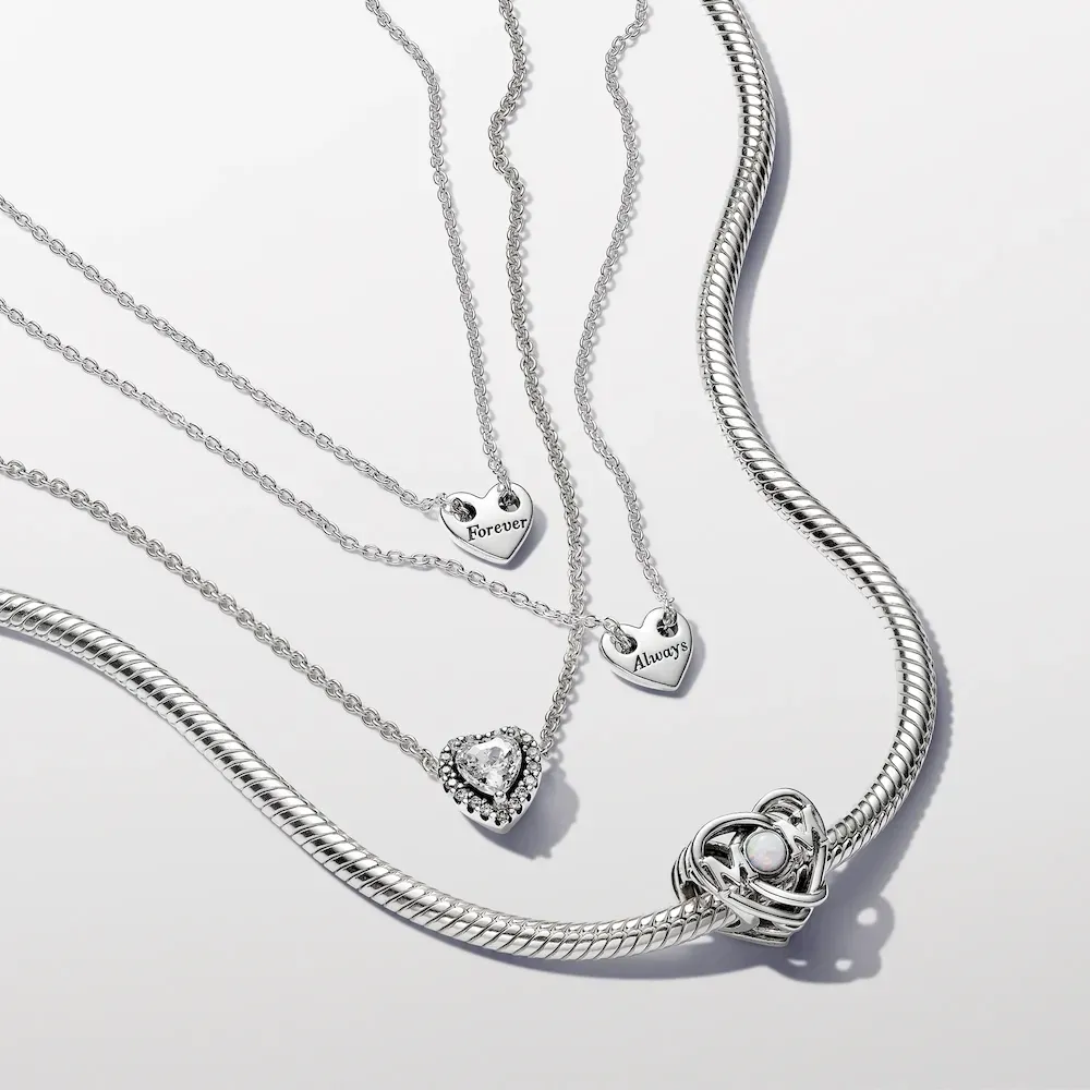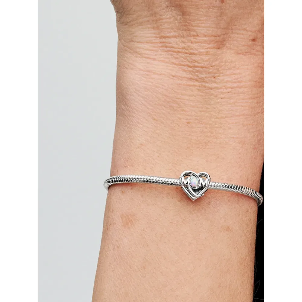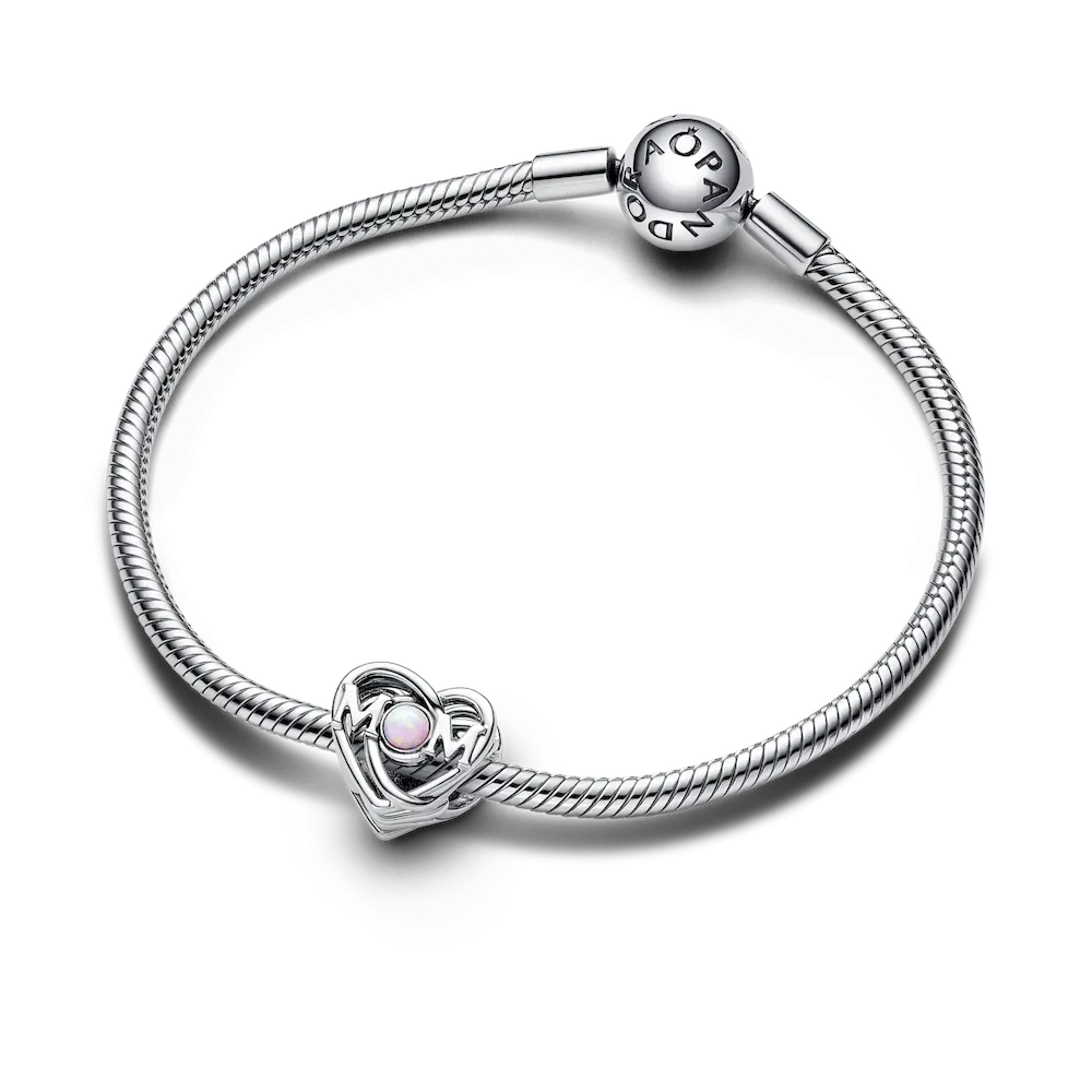 Show your love with the intricate Openwork Mom & Heart Charm , a heartfelt piece crafted in sterling silver. This Pandora mum charm captures the essence of motherhood with an intricately designed openwork heart. A central pink lab-created opal adds a touch of elegance and radiance. With the letters ‘Mom’ on one side and an engraving that reads