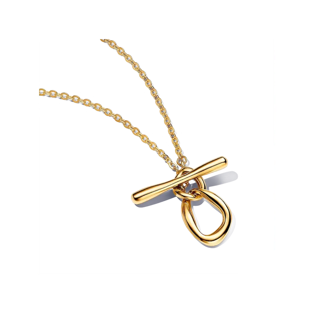 Choose sculptural style when you wear the Organically Shaped Circles T-bar Necklace. Two intentionally imperfect 14k gold-plated circles interlock, each with varying width and of slightly different size and shape. Close the necklace with the imperfectly-shaped T-bar closure. This necklace will serve as a reminder that nature is beautifully imperfect by design. Complete your everyday look with this delicate, effortless style, or gift it to a chic loved one in your life.