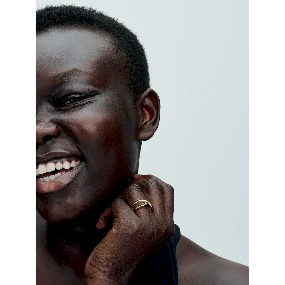 Bring dimension to your look when you wear the Organically Shaped Infinity Ring. This 14k gold-plated ring splits into two overlapping bands, connected at the back. Both bands have a slight wave and varied width for an undulating, organic look. Embodying the beauty found in nature’s organic shapes, this ring will add an architectural element to your look. Pair it with warm-toned styles for monochromatic minimalism or use it as the foundation for your next maximalist stack.