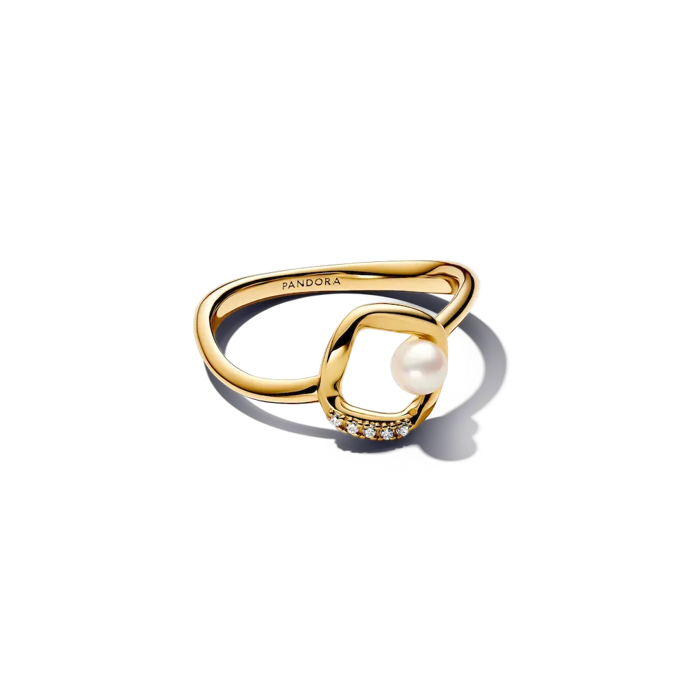 Discover a symbol of freedom and self-expression with this organically shaped circle ring, paved with clear cubic zirconia and adorned with a treated freshwater cultured pearl, perfect for those who embody creativity and playfulness.