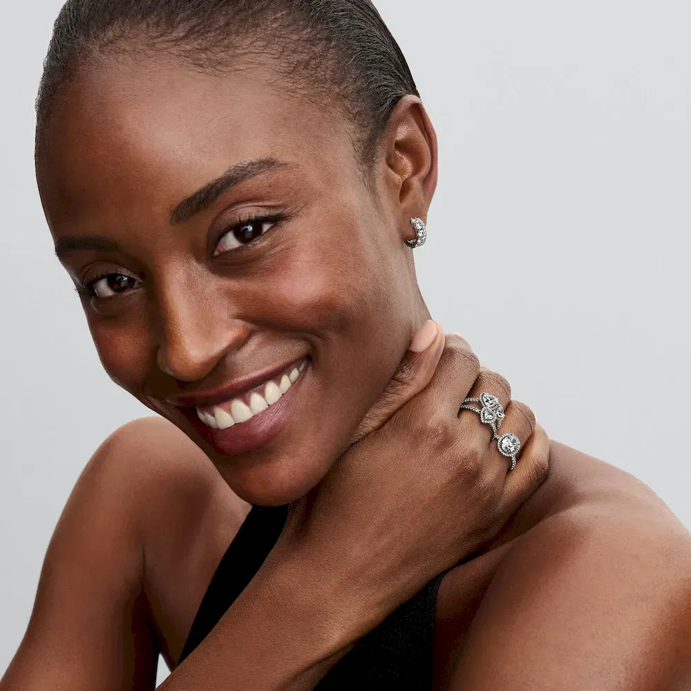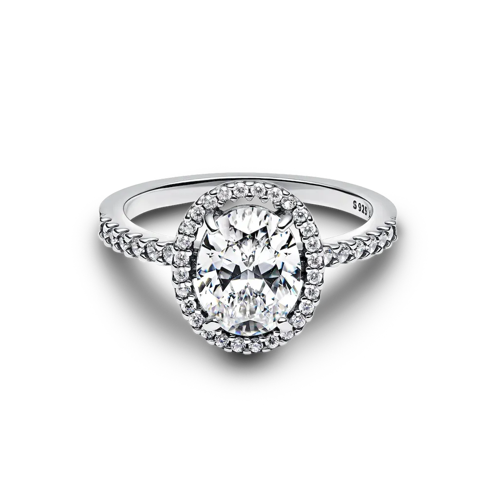 Go bold with the Oval Sparkling Halo Statement Ring. This sterling silver ring features a large centred raised oval stone surrounded by a halo of pavé, as well as a row of pavé on the top. Inspired by the bonds you love and cherish, this ring is designed to be stacked together with other styles, complimenting and adding sparkle to your look. Combine it with other cool-toned rings for a monochromatic effect or play with multi-tonal styling when you mix in other metals.