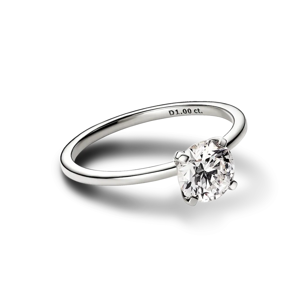 A fresh twist on a classic. The Pandora Era 14k White Gold Lab-grown Diamond Ring showcases a 1.00 carat round brilliant excellent cut lab-created diamond in a four-prong setting that combines round and flat profiles, creating a modern aesthetic and opening the stone to the light for amplified sparkle. This eye-catching 14k white gold ring is a piece to be worn and treasured for years to come – by you or someone who brings light into your world. Each Pandora Lab-grown diamond is treated with a post-growth color enhancement called annealing.