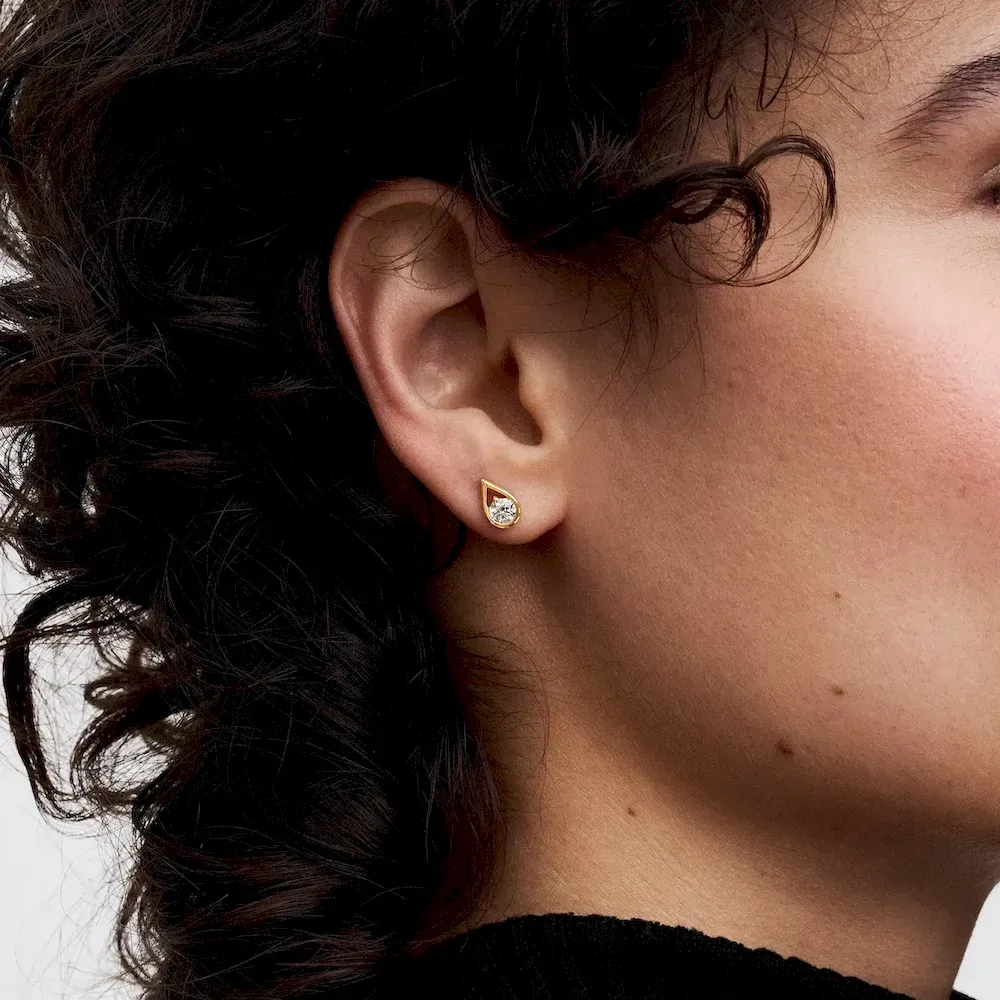 A pair of solid 14k yellow gold stud earrings each hand set with a 0.25 carat lab-grown diamond. A sparkling celebration of the infinite potential within all of us, these earrings feature a radiant round brilliant excellent cut lab-grown diamond suspended in our modern infinity setting. Each Pandora Lab-grown diamond is treated with a post-growth color enhancement called annealing.