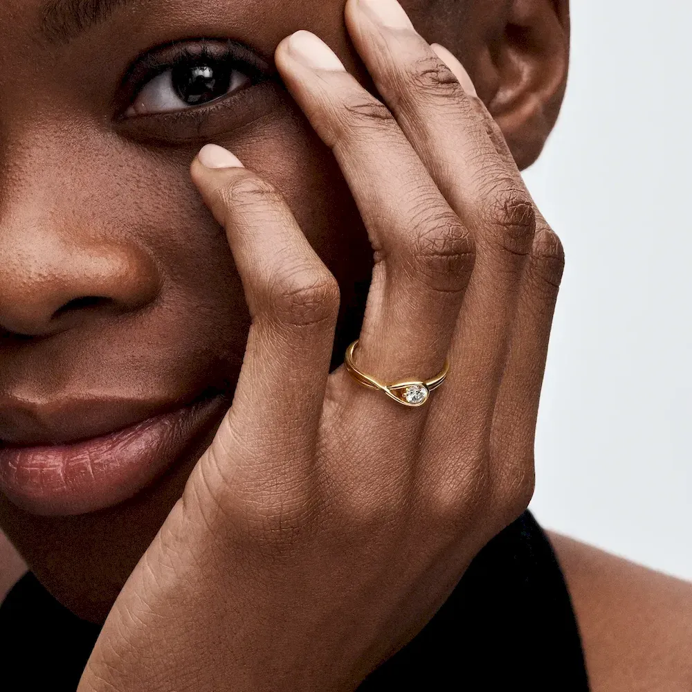 A solid 14k yellow gold ring hand set with a 0.25 carat lab-grown diamond. A beautiful statement of empowerment and possibility, or a simple yet eloquent declaration of love. This ring features a scintillating round brilliant excellent cut lab-grown diamond in a modern infinity setting that flows seamlessly around the stone. It can be worn alone or stacked with other rings from the Pandora Infinite collection. Each Pandora Lab-grown diamond is treated with a post-growth color enhancement called annealing.