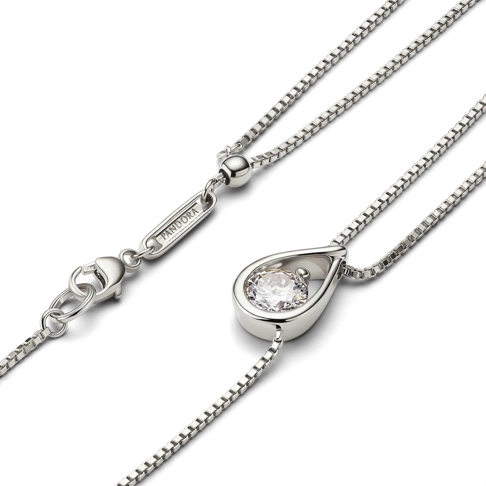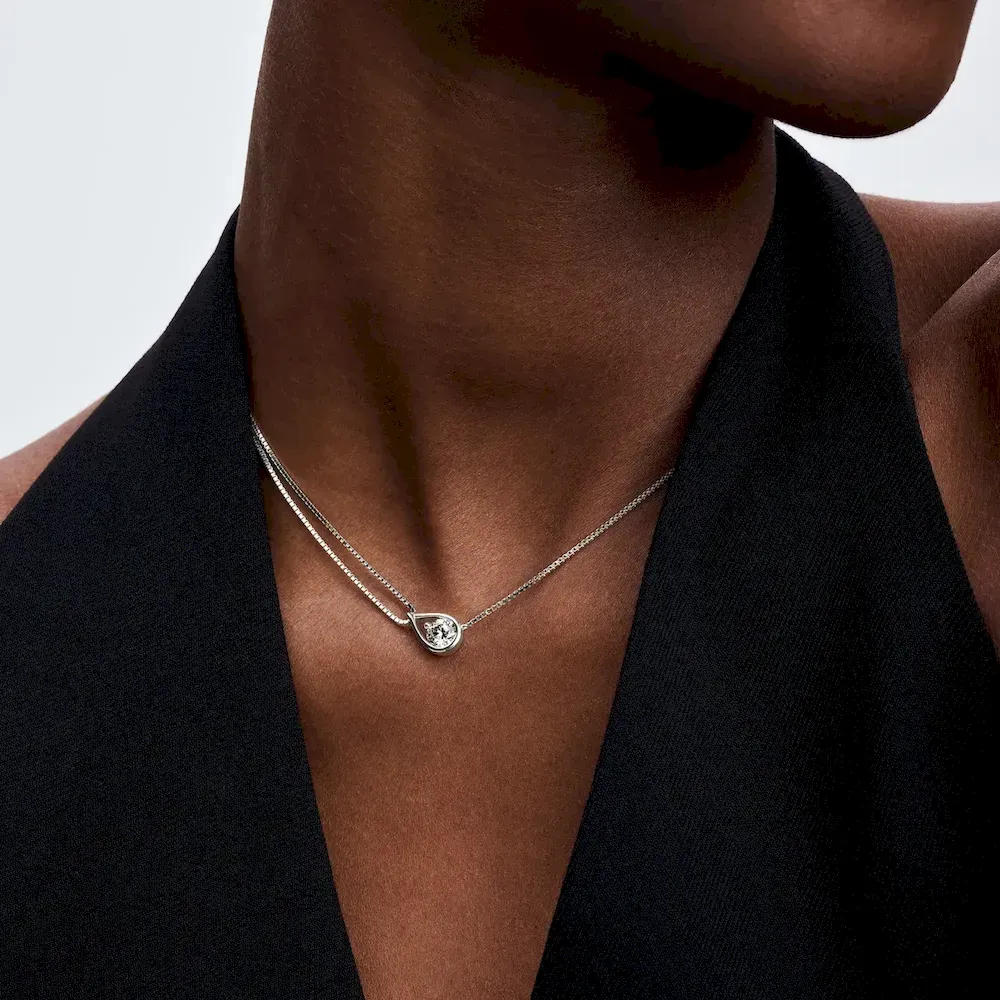 Discover lab-grown diamonds as you’ve never seen them before. A radiant 0.75 carat lab-grown diamond floats within our unique infinity motif crafted in 14k white gold, creating a captivating centerpiece for this pendant necklace. Our fluid infinity design symbolizes infinite joy, optimism and strength. The round brilliant excellent cut lab-grown diamond is suspended from a refined box chain in 14k white gold, which doubles up on one side to add a modern twist to the design. The double chain leads to a sliding ball closure, allowing you to adjust the length of the necklace so it shines on any neckline. Pandora Infinite lab-grown diamonds at and above 0.50 carat are certified by IGI. Each Pandora Lab-grown diamond is treated with a post-growth color enhancement called annealing.