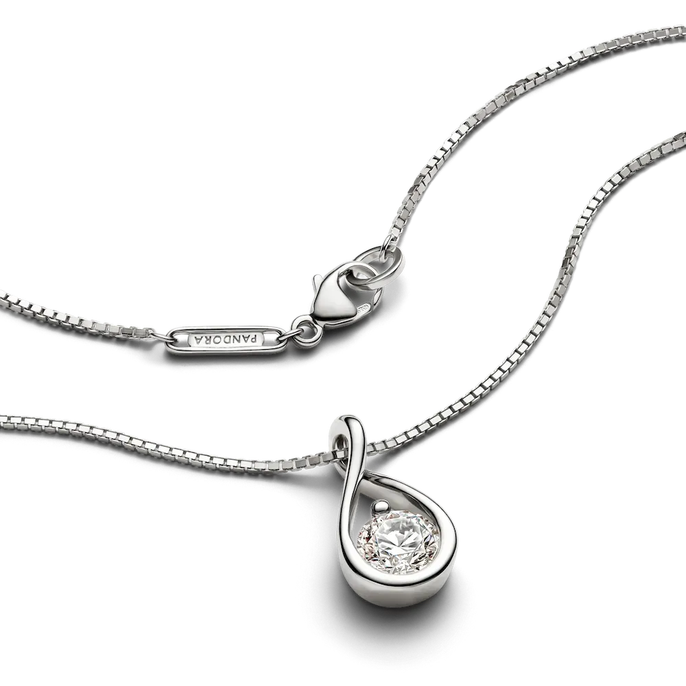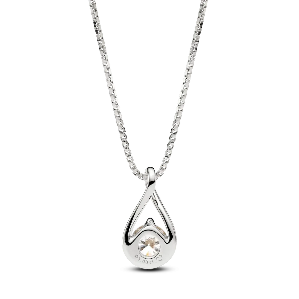 This Pandora Infinite 14k White Gold Lab-Grown Diamond Pendant Necklace is hand-set with a radiant 1.00 carat lab-grown diamond on a matching 14k white gold chain necklace. A powerful reminder of all we are, all we can be and the infinite possibility the future holds, this pendant features a round, excellent cut lab-grown diamond in a modern infinity setting that flows around the stone and suspends it in mid-air. An elevated piece that will shine on any neckline. Pandora Infinite lab-grown diamonds at and above 0.50 carat are certified by IGI. Each Pandora Lab-grown diamond is treated with a post-growth color enhancement called annealing.