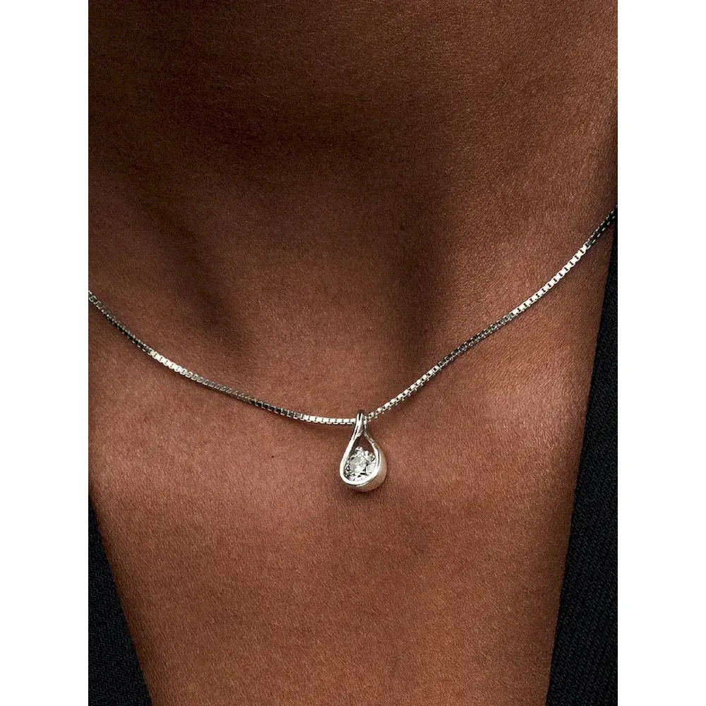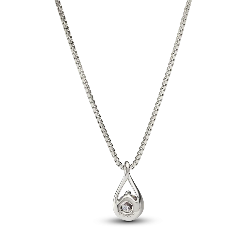 This 14k white gold pendant is hand-set with a radiant 0.50 carat lab-grown diamond on a matching 14k white gold box chain necklace. A powerful reminder of all we are, all we can be and the infinite possibility the future holds, this pendant features a round brilliant excellent cut lab-grown diamond in a modern infinity setting that flows around the stone and suspends it in mid-air. An elevated piece that will shine on any neckline. Pandora Infinite lab-grown diamonds at and above 0.50 carat are certified by IGI. Each Pandora Lab-grown diamond is treated with a post-growth color enhancement called annealing.