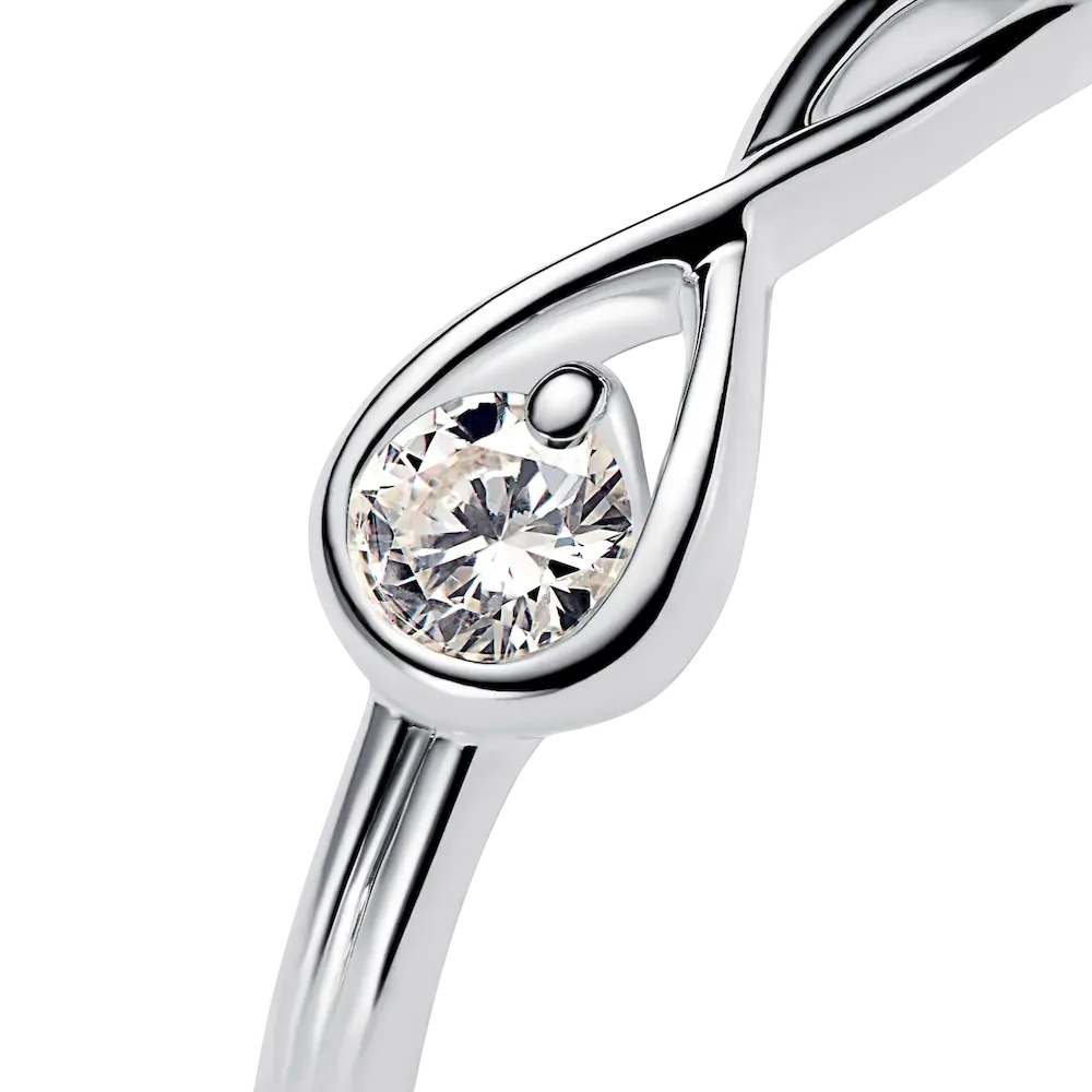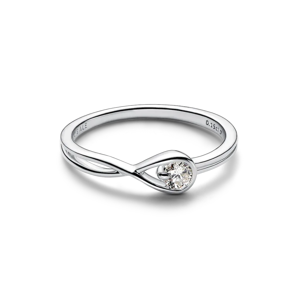 A solid sterling silver ring hand set with a 0.15 carat lab-grown diamond. A beautiful statement of empowerment and possibility, or a simple yet eloquent declaration of love. This ring features a scintillating round brilliant excellent cut lab-grown diamond in a modern infinity setting that flows seamlessly around the stone. It can be worn alone or stacked with other rings from the Pandora Infinite collection. Each Pandora Lab-grown diamond is treated with a post-growth color enhancement called annealing.