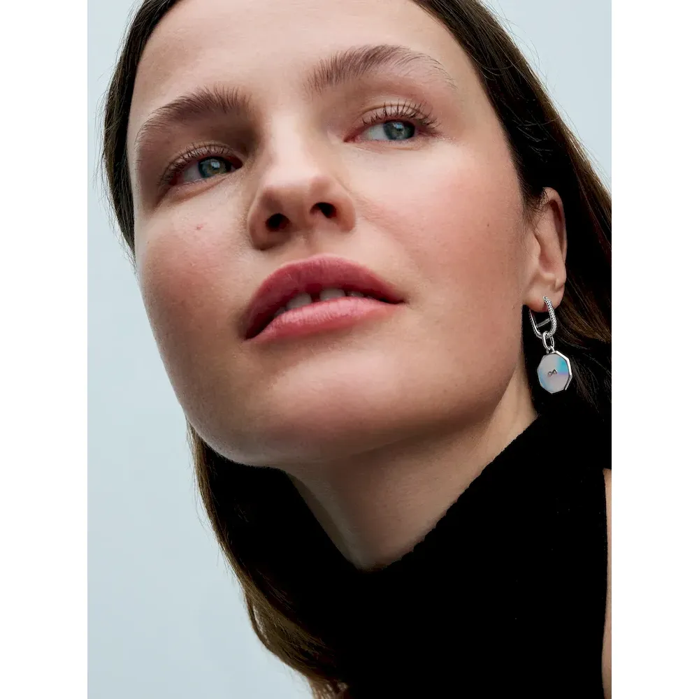 With the Pandora ME Infinity Medallion Charm, the possibilities are endless. An octagon-shaped sterling silver disc features a raised infinity sign surrounded by tie dye–inspired multicolored enamel. On the reverse side, cut-out rays with microbead details surround a raised heart at center. Stack this infinity charm with other symbolic styles for a maximalist look with personal meaning, or wear it solo on a carrier for a sleek, pared-down effect. Can only be styled on openable links.