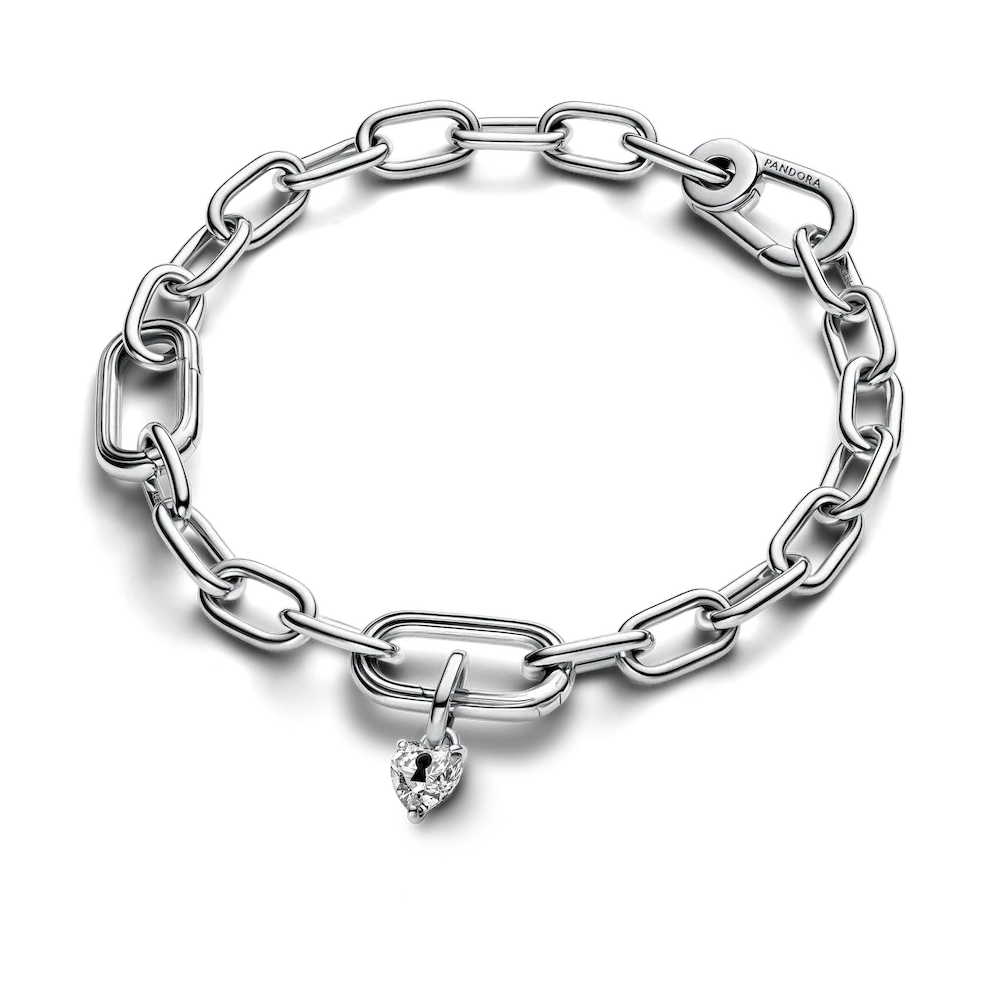 Find your match with the Pandora ME Keyhole Heart Mini Dangle Charm. This sterling silver charm features a heart-shaped clear cubic zirconia stone with a keyhole motif in black enamel, inspired by the symbolism of tattoo art. Behind the stone is a heart-shaped cut-out to let the light shine through. Pair it with the Pandora ME Key Mini Dangle Charm to symbolise those relationships that just