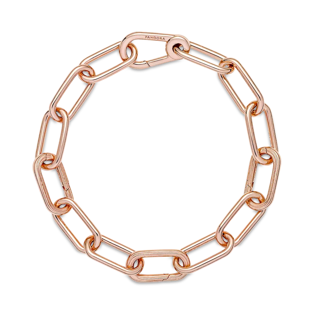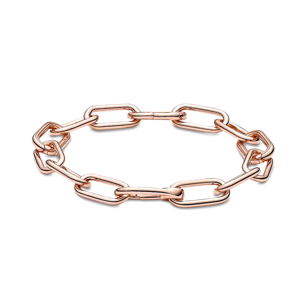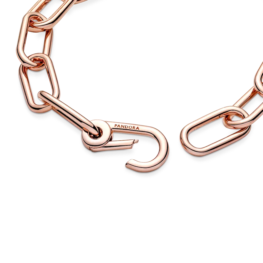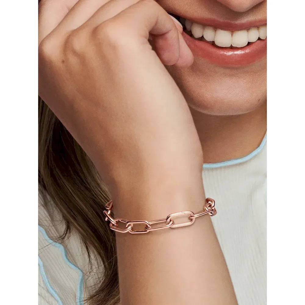 Wear your mantra on your wrist. Our 14k rose gold-plated Pandora ME Medium-Link Chain Bracelet holds endless styling possibilities. The bracelet features three openable links, designed with a grooved surface to set them apart, styling links and a carabiner clasp closure. First customise your link chain: one set of interlocking styling links can be swapped out between each openable link for four small interlocking links, a styling double link or one styling link – keep the original length or adjust it to suit you. Once you’ve curated your link chains, remix your look with up to two meaningful medallion charms or up to eight mini dangle charms on each openable link, or with one medallion charm per styling link to show the world what you’re about. Please note this item is only compatible with Pandora ME jewelry and will not fit our other collections.